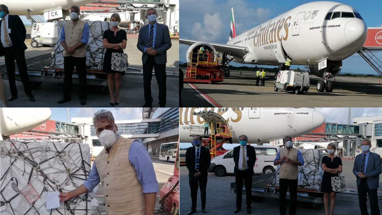 Les vaccins ont été réceptionnés sur le tarmac de l’aéroport de Plaisance le samedi 15 mai 2021 par Maneesh Gobin, ministre de l’Agro-industrie et de la Sécurité alimentaire, le Prof. Vêlayoudom Marimoutou, Secrétaire général de la COI, Vincent Degert, ambassadeur de l’Union européenne, Mme Florence Caussé-Tissier, ambassadrice de France, et M. André Pouillès-Duplaix, directeur de l’AFD.