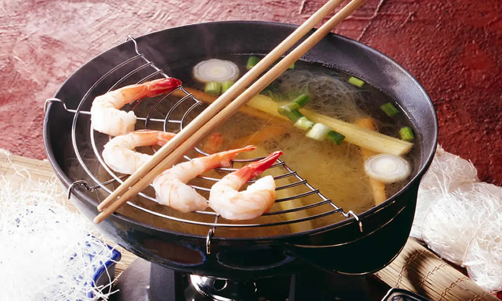 « Vos invités devront cuire leurs ingrédients en les plaçant dans une petite épuisette ou les piquer avec des baguettes qu’ils plongeront par la suite dans le bouillon », explique le chef Rudy Yip.