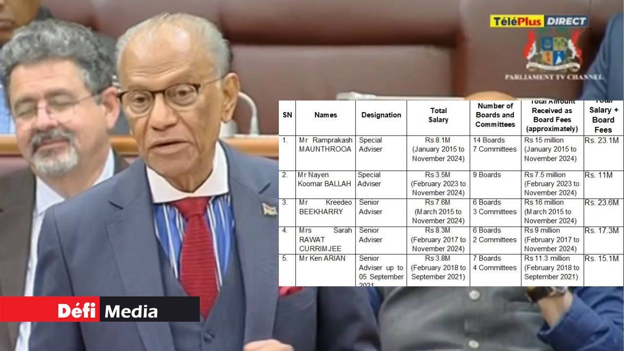Le Premier ministre Navin Ramgoolam a révélé que cinq anciens conseillers de son prédécesseur ont touché Rs 90,1 millions entre 2015 et 2024, grâce à des nominations sur des conseils d’administration et des émoluments cumulés importants.