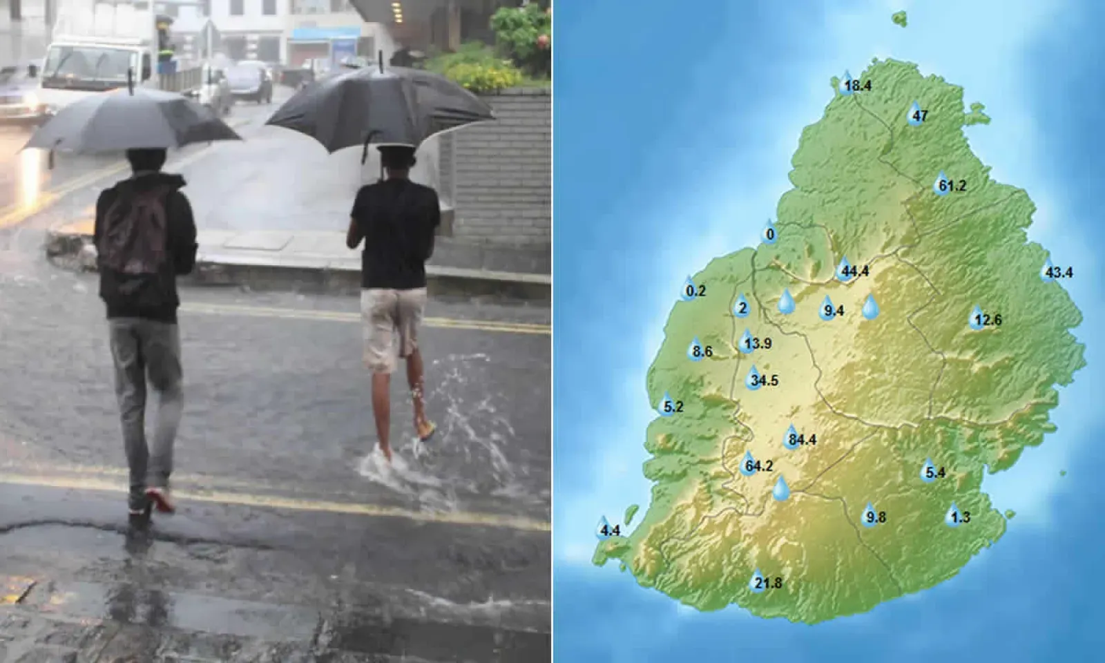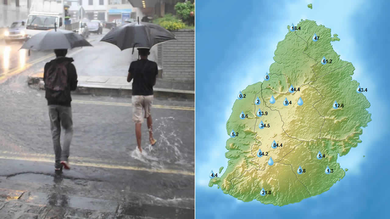 Mon-Bois, situé non loin de Mare-aux-Vacoas, a recueilli la plus forte pluviométrie en 24 heures (entre 10 h lundi et 10 h ce mardi) avec 84.4 mm de pluie.