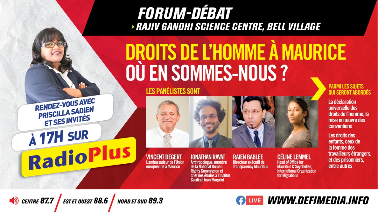 La déclaration des Droits de l’homme à Maurice : où en sommes-nous ? C'est le thème d’un forum-débat qui sera organisé ce mardi après-midi 10 décembre par l’Union Européenne en partenariat avec Radio Plus au Rajiv Gandhi Science Centre à Bell Village. Cela, dans le cadre de la Journée internationale des droits de l’homme, observée ce 10 décembre.