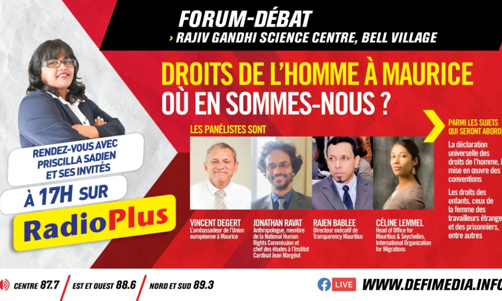 Rendez-vous donc avec Priscilla Sadien et ses invités à partir de 17 heures sur Radio Plus. L'émission sera également diffusée en live streaming sur la page Facebook du Défi Media Group.