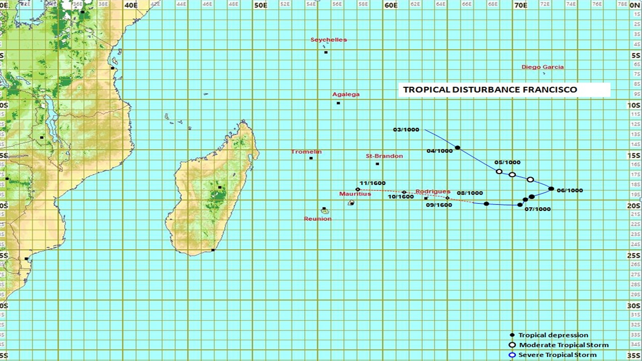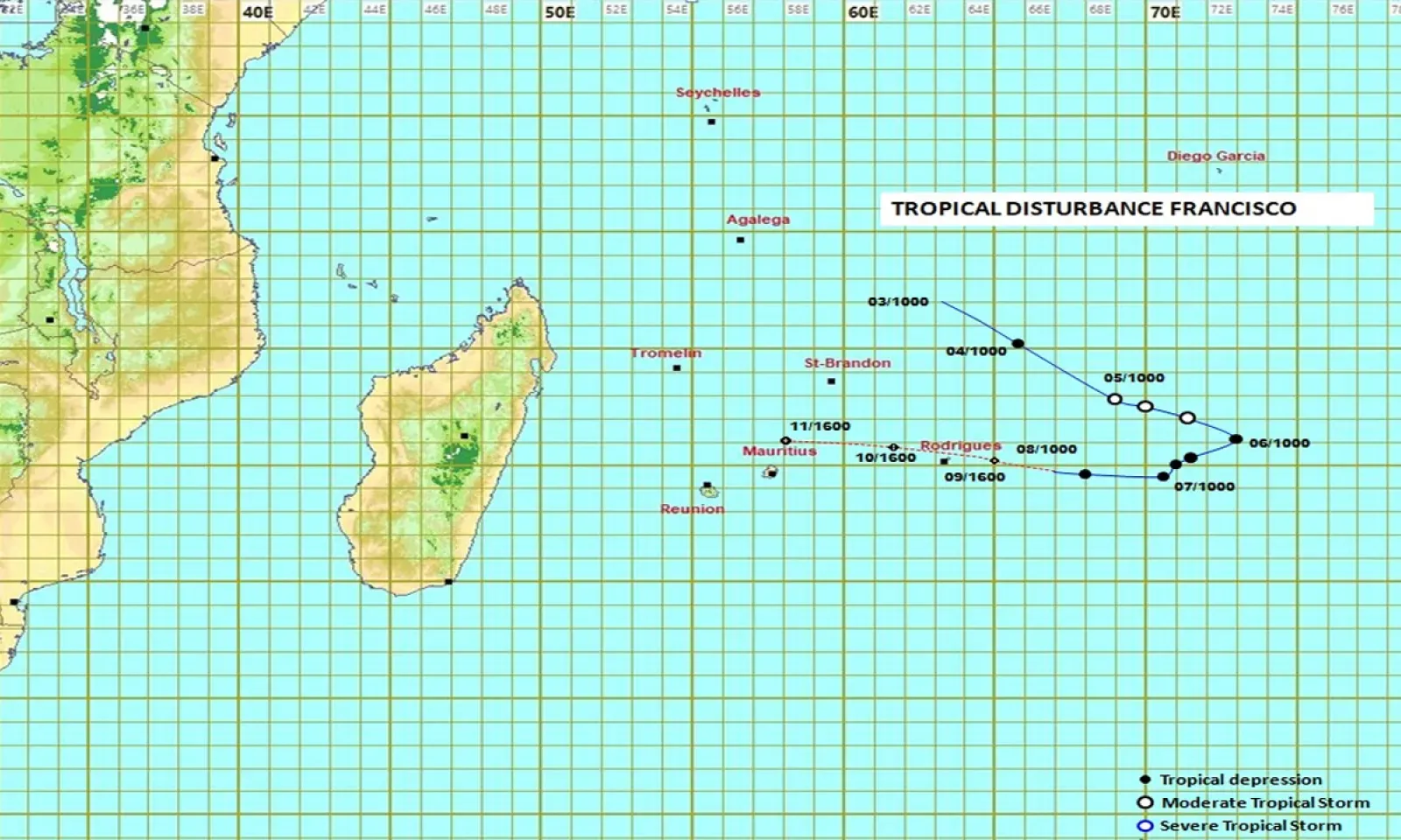 Maurice pourrait connaître le même type temps à partir de mardi, selon la station météorologique de Vacoas. à moins d’un changement drastique des conditions atmosphériques, il n’est pas prévu que Francisco reprenne du poil de la bête et s’intensifie à nouveau. Les conditions sont peu favorables pour cela, explique le service de la météo.