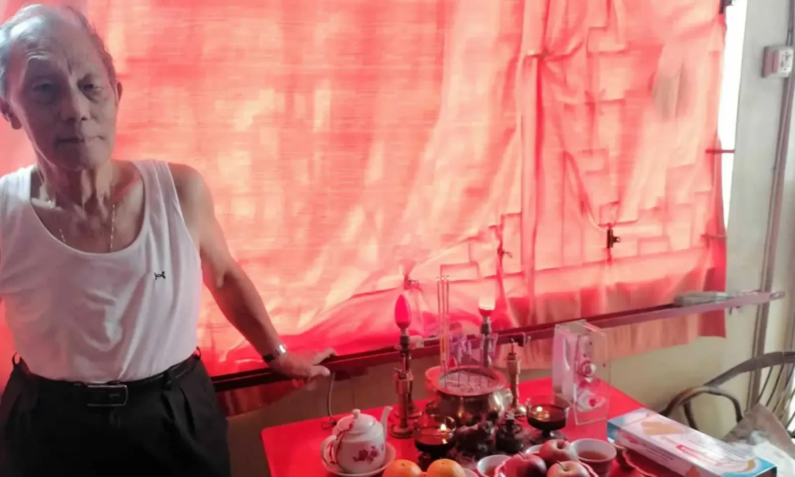 En effet, cela fait quelques années que François souffre de problèmes de cartilage. Jacqueline lui est d’une grande aide, car il peut à peine marcher. « On ne va plus à la pagode. Nous prions devant cette table et nous faisons des offrandes à tous nos Dieux, qu’ils soient végétariens ou autre. On leur rend grâce de chez nous dans le respect de toutes nos traditions », dit-il.