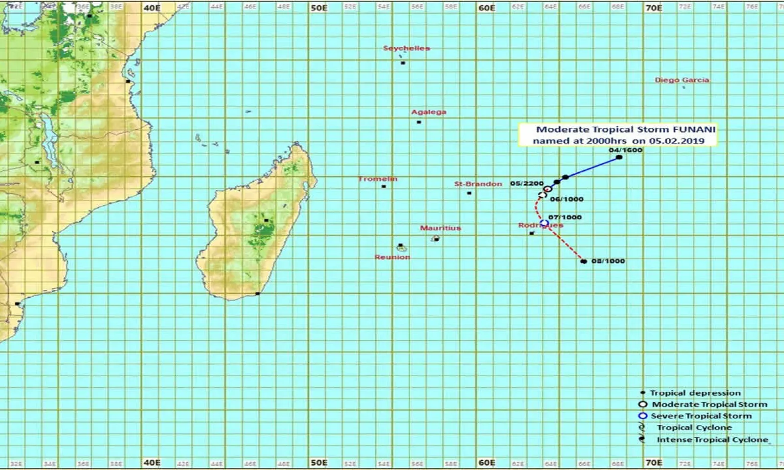 La forte tempête tropicale Funani s’approche de Rodrigues et passera à son point le plus rapproché de l’île demain matin, jeudi 7 février, soit à environ 160 km de la côte est-nord-est de Rodrigues.
