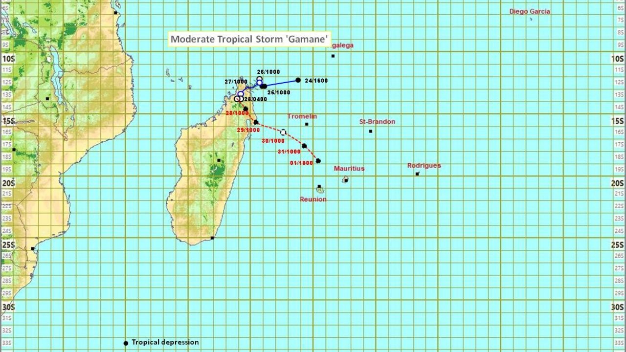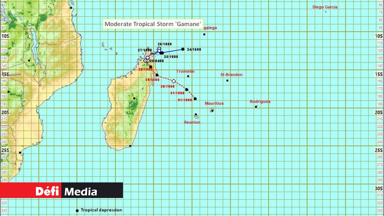 A 04h00 ce matin, la tempête tropicale modérée Gamane était centrée autour du point 13.8 degrés sud en latitude et 48.9 degrés est en longitude, soit à environ 1 140 km loin au nord-ouest de Maurice. Elle se déplace lentement dans une direction du sud-ouest à environ 5 km/h.