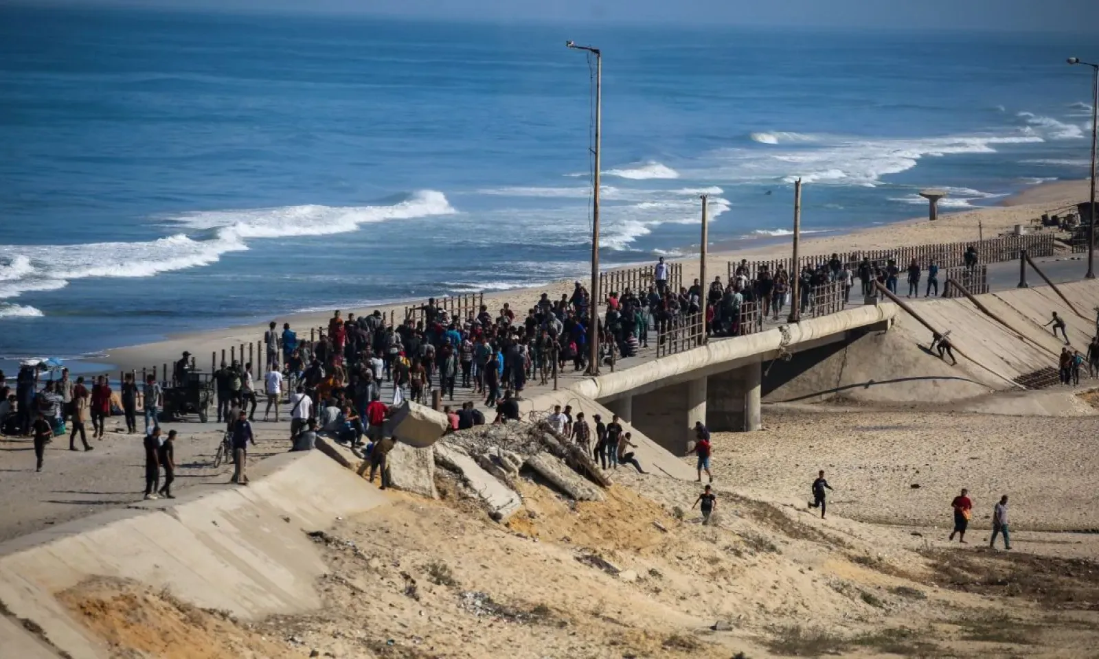 Une file de piétons, presque ininterrompue, marche le long de la route al-Rachid, axe côtier longeant la Méditerranée, en direction du nord de la bande de Gaza et quelques véhicules avancent lentement dans le même sens, au milieu de la foule.