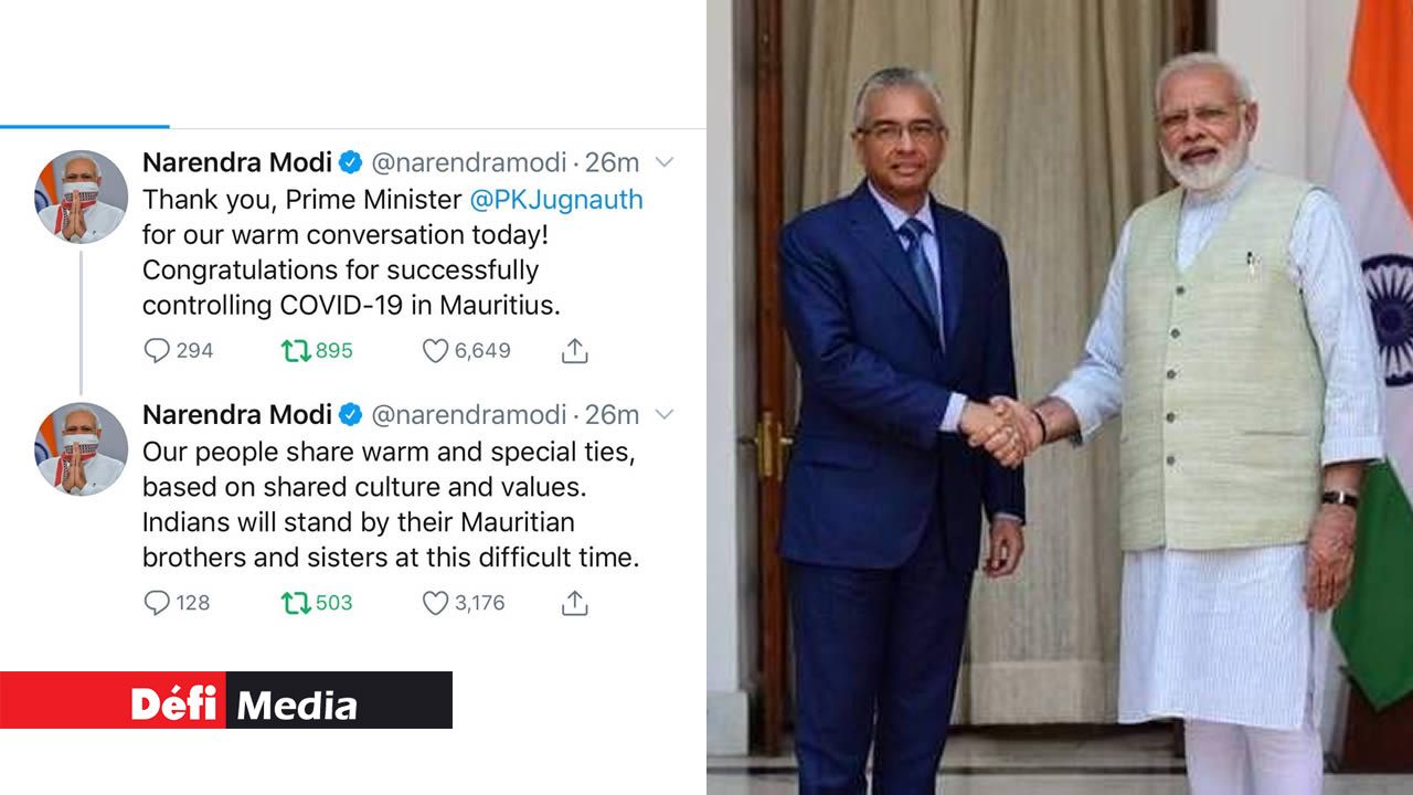 « Thank you prime Minister @PKJugnauth for our warm conversation today ! Congratulations for successfully controlling COVID-19 in Mauritius. Our people shar warm ties, based on shared culture ans values. Indians will stand by their Mauritian brothers and sisters at this difficult time », a-t-il posté sur son compte Twitter.