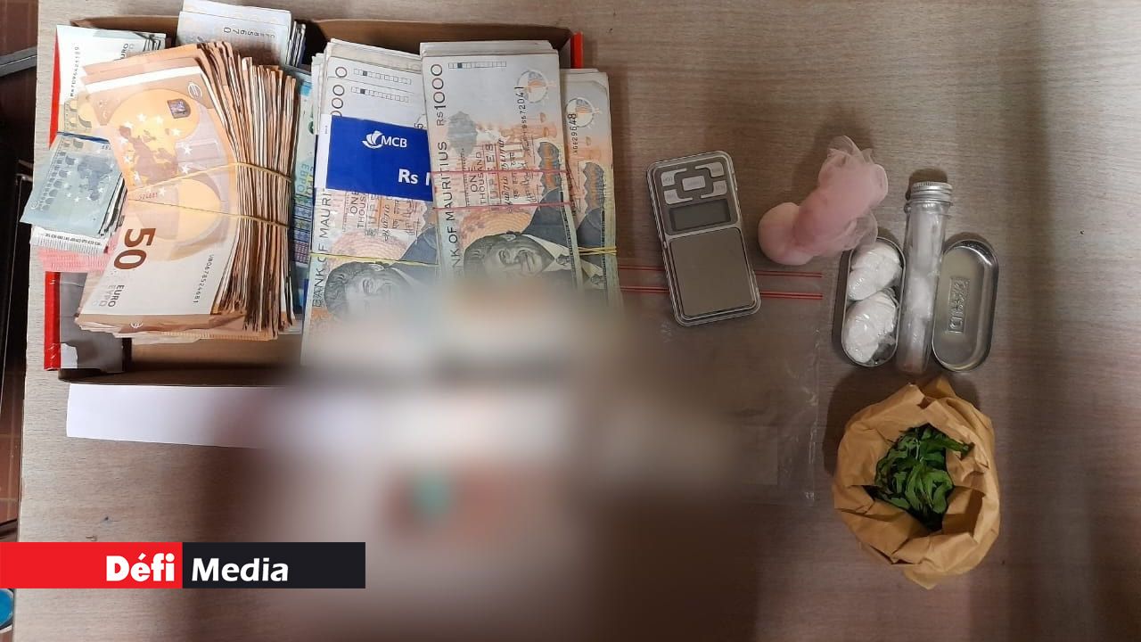 Les limiers sont tombés sur 3,7 grammes de cocaïne, 42,5 grammes de crystal meth et 95 grammes de cannabis. Une somme de Rs 1,2 million et 21 150 euros ont également été découverts sur place.