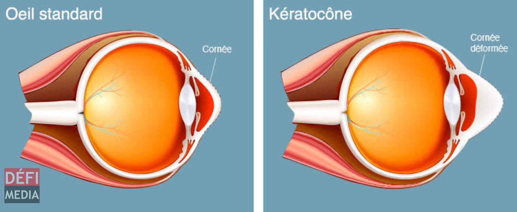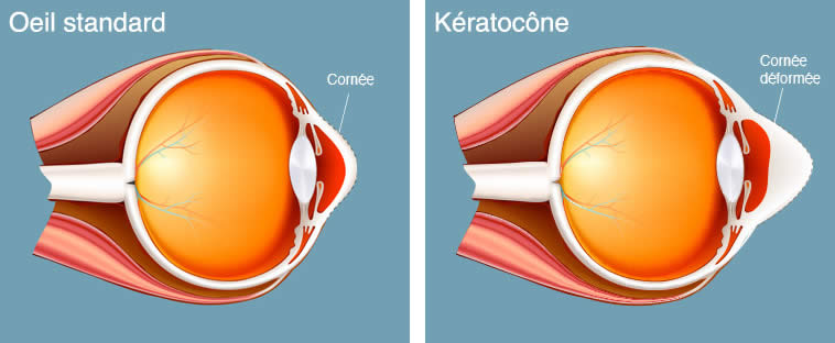 [[{"type":"media","view_mode":"media_large","fid":"10467","attributes":{"class":"media-image aligncenter size-full wp-image-18965","typeof":"foaf:Image","style":"","width":"758","height":"312","alt":"Oeil"}}]]Le kératocône est une maladie oculaire évolutive lors de laquelle la cornée, qui est normalement ronde et en forme de dôme, s’amincit et se gonfle pour former un cône. Cette forme conique est irrégulière et fait dévier la lumière à mesure qu’elle entre dans l’œil. L’irrégularité de la cornée peut alors engendrer une vision floue. La vision floue, causée par le kératocône, est différente de celle provoquée par d’autres erreurs de réfraction communes, comme la myopie. Aux stades avancés du kératocône, il peut être difficile d’avoir une vision satisfaisante, même avec des lunettes ou des lentilles. Le kératocône peut se développer dans un œil, voire dans les deux, et commence souvent à l’adolescence ou au début de la vingtaine. Cette anomalie se développe chez 1 personne sur 1 000, en moyenne.