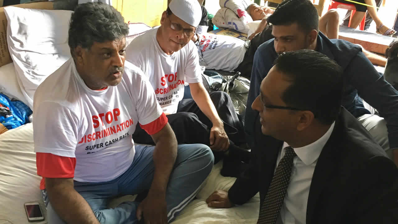 L’ancien ministre des Services financiers a rendu visite aux clients du Super Cash Back Gold (SCBG) et de la Bramer Assets Management (BAM). Ils ont entamé une grève de la faim illimitée le mardi 9 mai. Roshi Bhadain annonce qu’il compte offrir ses services d’avocat, gratuitement, pour qu’ils puissent se faire rembourser.