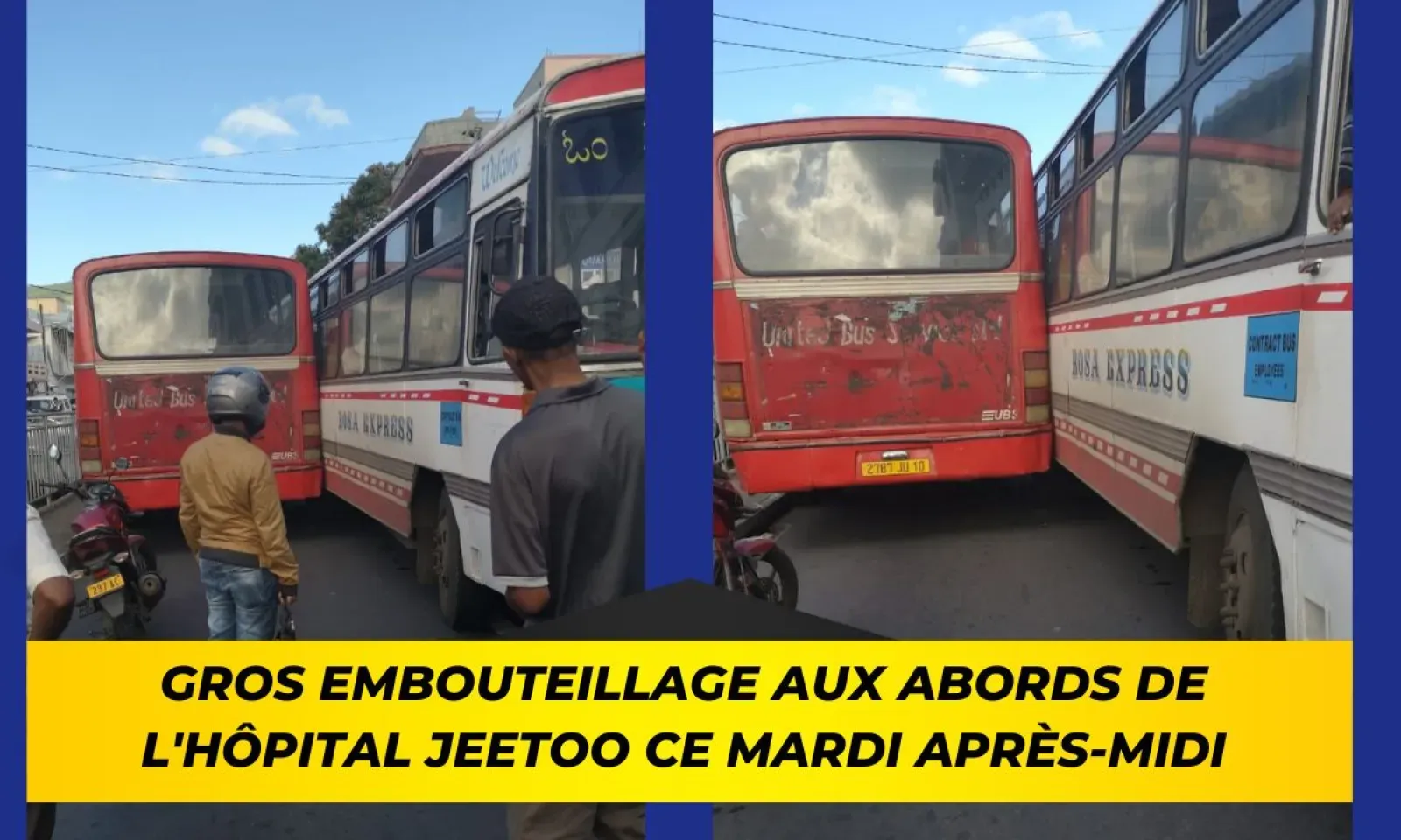Image Gros embouteillage aux abords de l'hôpital Jeetoo vers 14h45 ce mardi. Deux bus se sont retrouvés coincés l'un à côté de l'autre dans des circonstances encore inconnues. Publicité View the discussion thread.