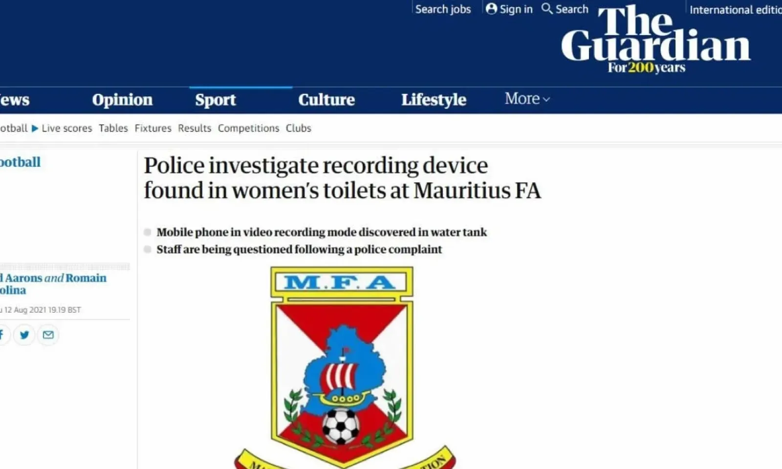 Mauvaise pub pour le pays et le football mauricien sur l’échiquier international. Cela suite à la plainte pour voyeurisme à la police par la secrétaire administrative Mila Sinnasamy au sein de la Mauritius Football Association (MFA). Le journal anglais « The Guardian » a fait état de ce scandale, qui secoue le football local, sur son site Web hier soir, jeudi 12 août, titrant : « Police investigate recording device found in women’s toilets at Mauritius FA ».
