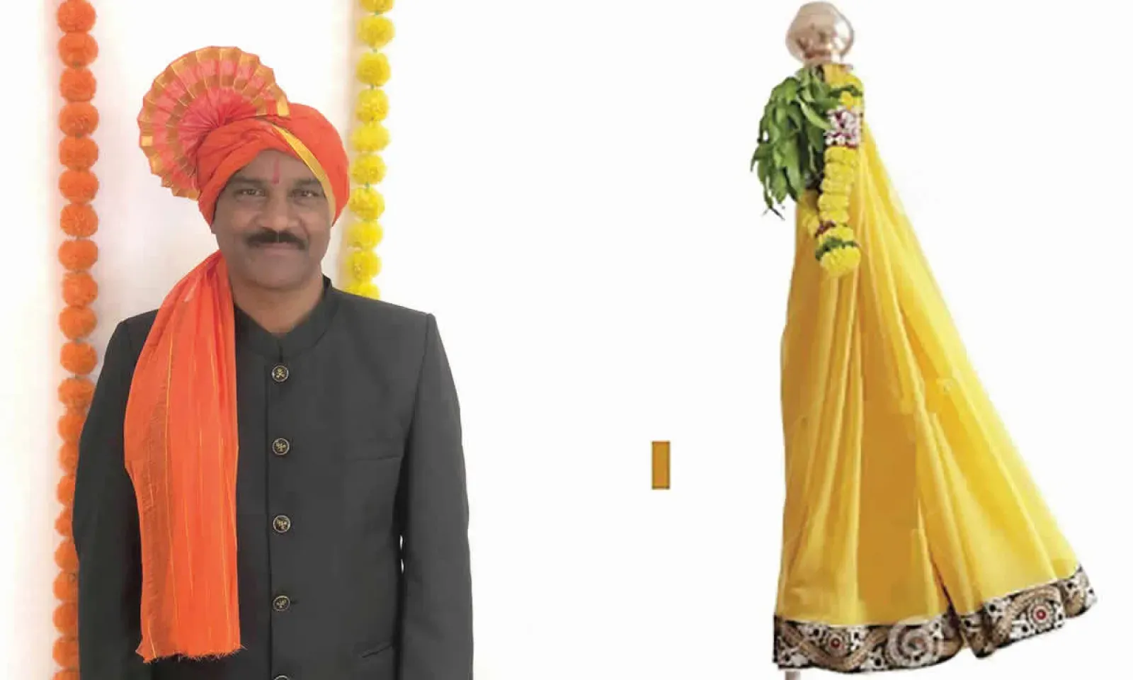 « Nous fabriquons le ‘gudhi’ avec une tige de bambou. L’extrémité de cette tige est recouverte d’un tissu neuf, d’une guirlande de fleurs, de feuilles de neem et de mangue, d’une sucrerie puis un ‘tambia’, récipient d’eau en cuivre est inverser en haut. Au bas du ‘gudhi’ sur le sol, nous dessinons un rangoli », explique-t-il.