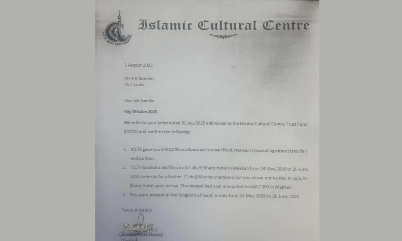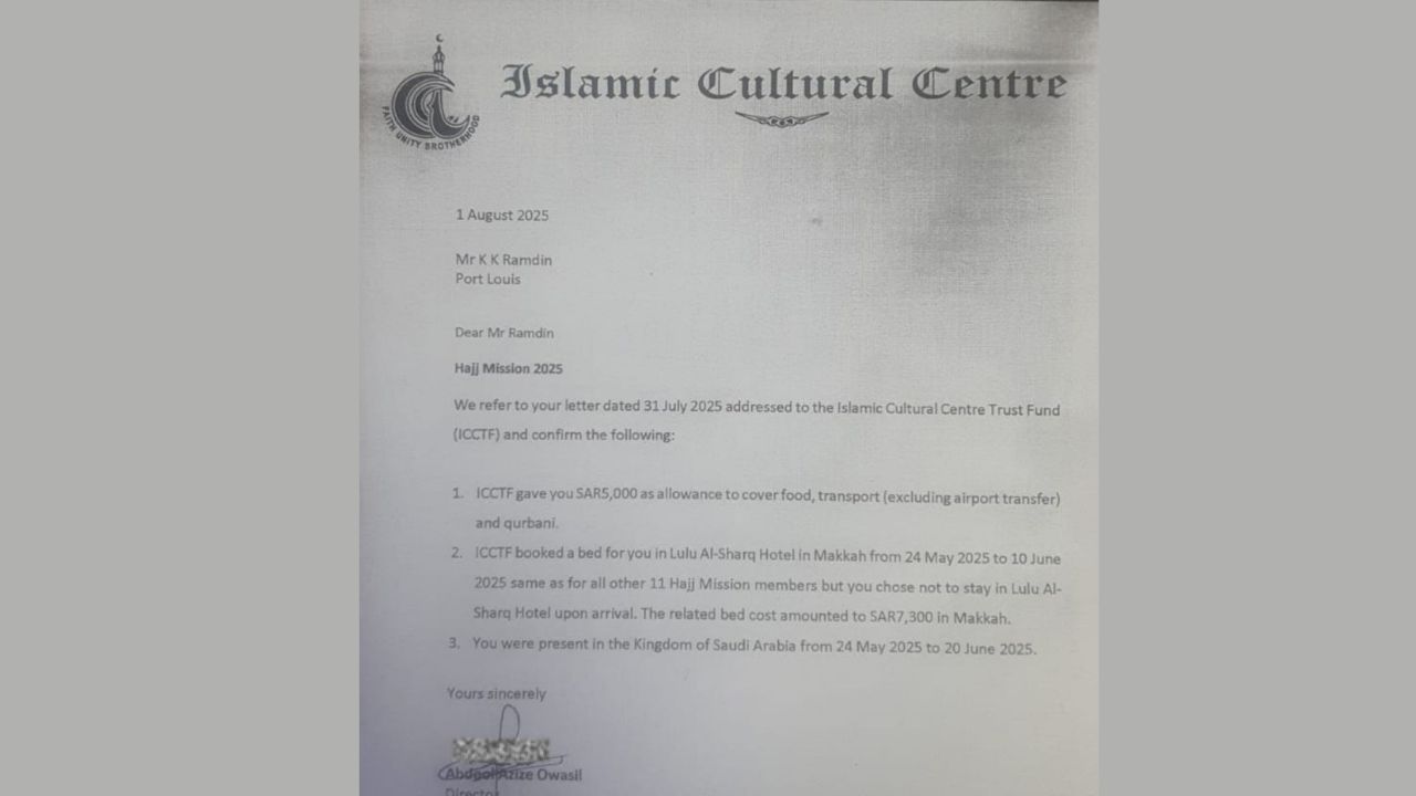 Le 31 juillet, Al-Khizr Ramdin adresse au directeur de l’ICC des copies de ses factures d’hébergement aux hôtels Anjum et Lidan Alfidy à La Mecque, pour un montant total de Rs 102 842,56. Dans son courrier, il précise qu’il ne réclamera aucun remboursement : « This contribution was in good faith and reflects my personal commitment to supporting the smooth conduct of the Hajj 2025 pilgrimage. »