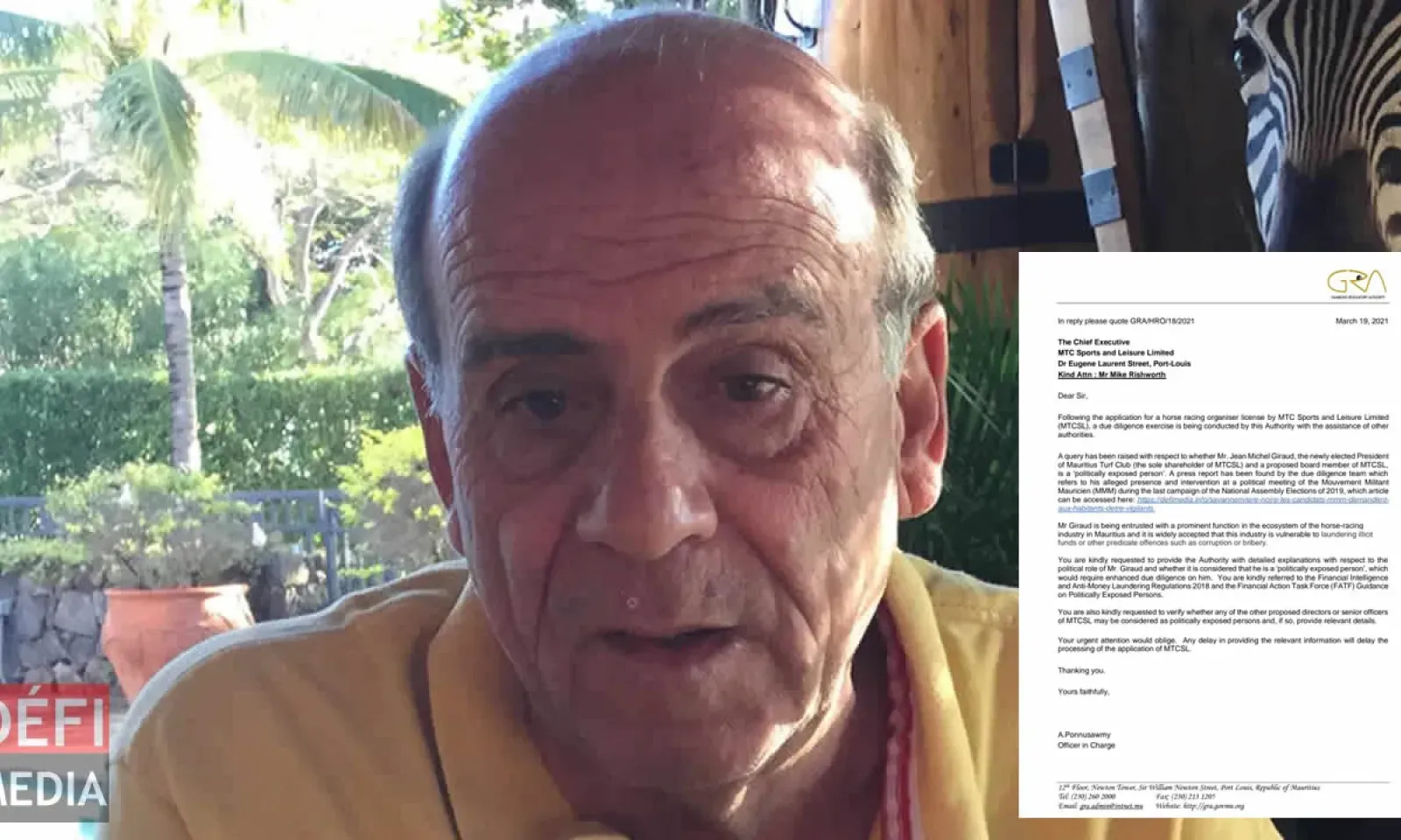 La Gambling Regulatory Authority (GRA) veut savoir si Jean Michel Giraud, président du Mauritius Turf Club Sports and Leisure (MTCSL), a une quelconque connection avec la politique active. L’autorité hippique s’appuie sur un article en ligne du site www.defimedia.info, qui relate un rassemblement politique du Mouvement Militant Mauricien (MMM) en octobre 2019, pendant la campagne électorale, dans lequel il est relaté que M. Giraud aurait pris la parole.