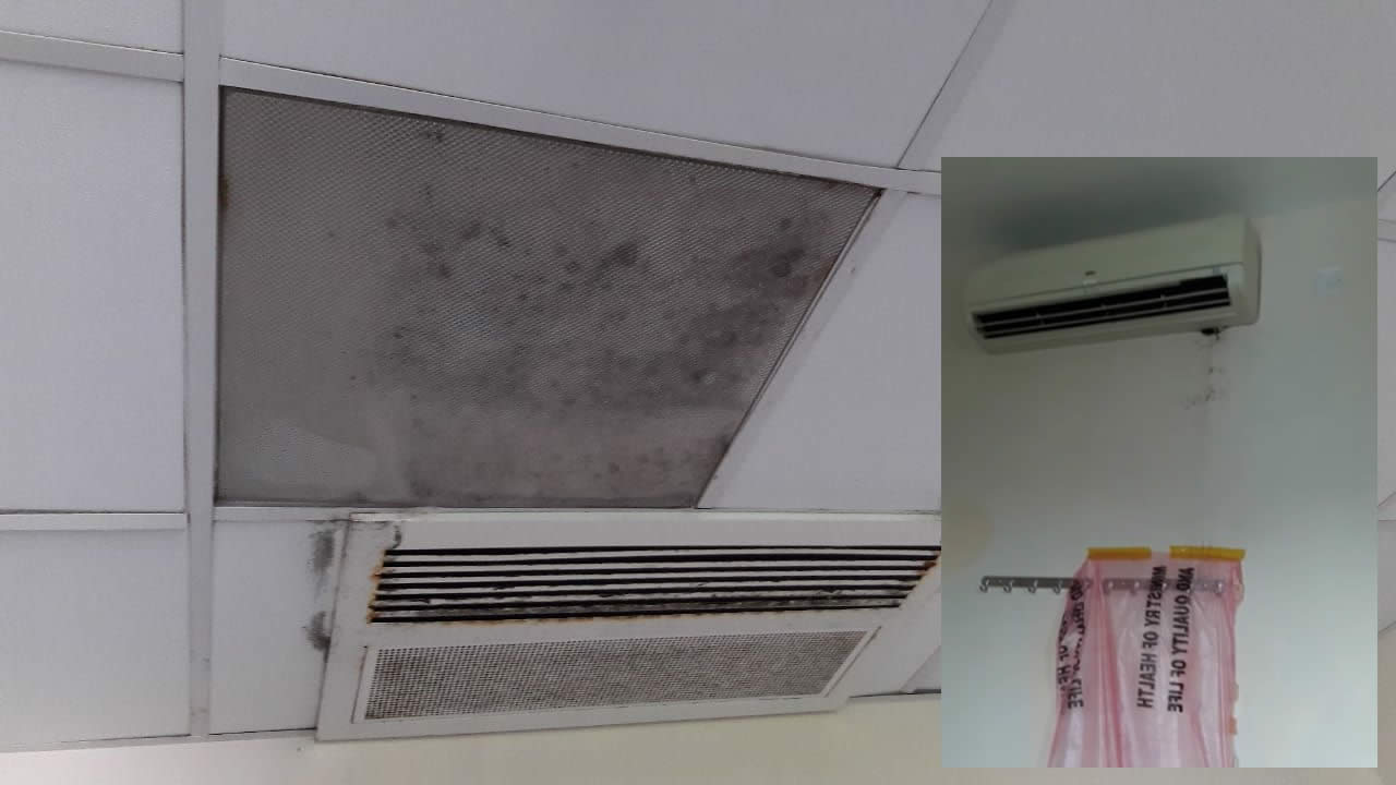 Autre constat que nous avons fait : l’entretien du système de climatisation laisse à désirer à l’établissement hospitalier. L’accumulation de poussière et de rouille favorise la prolifération de bactéries. Dans un département, une conduite en plastique est utilisée pour acheminer l’eau provenant d’un climatiseur vers une poubelle.