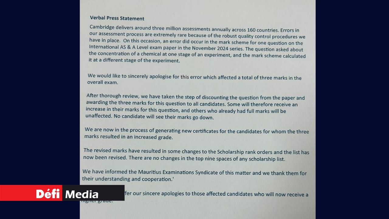 Cambridge a présenté ses excuses et a remercié le Mauritius Examinations Syndicate pour sa collaboration.