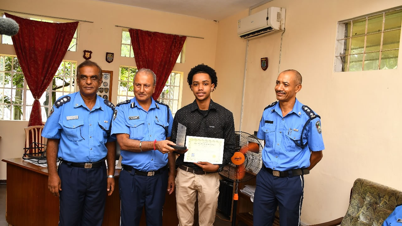 David Manan, fils du constable Manan affecté au poste de police de Petit-Gabriel à Rodrigues, a été reçu ce matin par le Chief Of Police (COP) de Rodrigues, l’Assistant Commissaire de Police (ACP) Mohunlall Madhow, en présence des surintendants Rambhojun et Raboude.