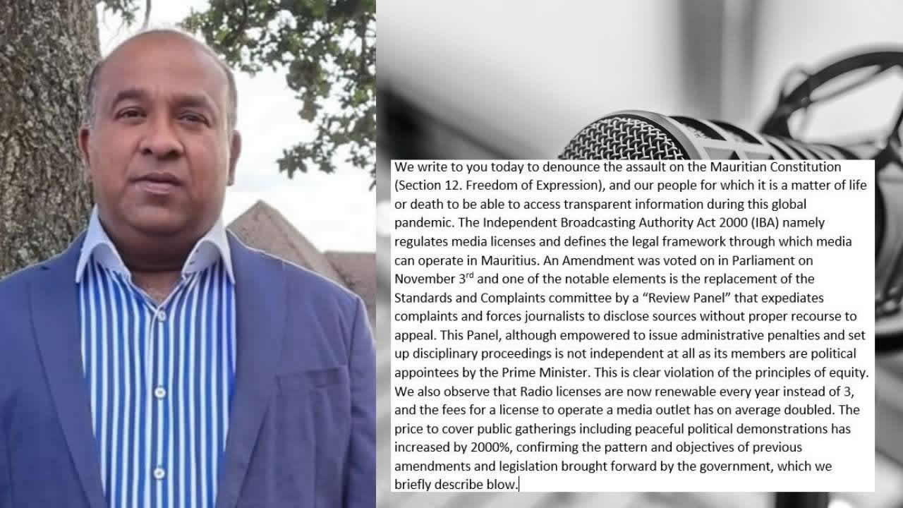 Covilen Narsinghen, le président de la Mauritius Global Diaspora, basée en Angleterre, a adressé une lettre a 30 organisations internationales, notamment Amnesty International, Reporters Sans Frontieres, International Consortium of Investigative Journalists et Human Rights Foundation, pour dénoncer les amendements apportés à l’Independent Broadcasting Authority (IBA) Act. Lesquels permettent à l’autorité régulatrice de l’audiovisuel à Maurice de bénéficier d’un arsenal renforce pour sanctionner les radios privées.