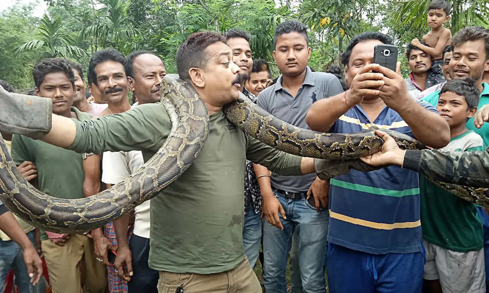 Un garde forestier indien a failli être étranglé par un python pendant qu'il posait pour des photos avec le serpent géant. Sanjay Dutta a été appelé dimanche par des villageois au Bengale-Occidental après qu'un python de 40 kg a avalé une chèvre vivante. Une fois sur place, au lieu de placer le serpent en toute sécurité dans un sac, le garde forestier l'a enroulé autour de son cou et a posé pour des photos avec des villageois sidérés.