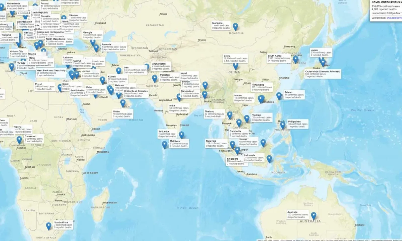 - A 21 h ce mardi 10 mars, plus de 116 015 cas d'infection au coronavirus ont été recensés depuis décembre dans 105 pays et territoires, entraînant 4 089 décès dans le monde.