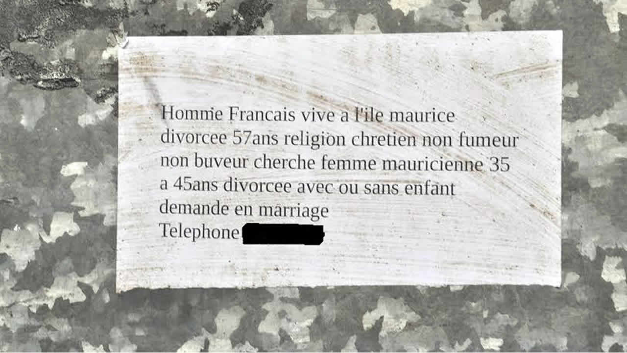 Mais nous sommes tombés sur une annonce un peu particulière : celle d’un présumé ressortissant français à la recherche d’une Mauricienne en vue de mariage. L’annonce a été placardée sur la route principale à Coromandel. Elle annonce : « Homme français vivant à l’ile Maurice, divorcé 57 ans, religion chrétienne, non fumeur, non buveur, cherche Mauricienne 35 à 45 ans divorcée avec ou sans enfants pour une demande en mariage. » L’avis est accompagné d’un numéro de téléphone.