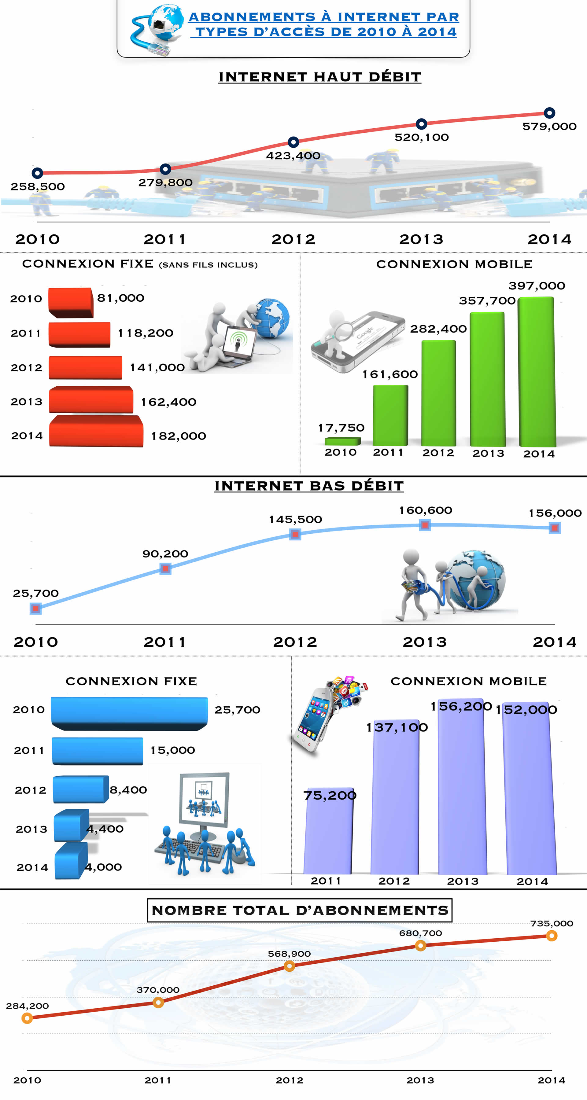 Les Mauriciens ont toujours préféré les connexions à haut débit. Il suffit de se pencher sur les chiffres de Statistics Mauritius pour s’en rendre compte. En 2010, on dénombrait 284 200 abonnements à Internet à Maurice, dont 258 500 à haut débit. À la fin de l’année 2014 (les chiffres de 2015 ne seront disponibles qu’en juillet 2016), sur 735 000 abonnements, 579 000 étaient à haut débit. On constate également que les connexions sur mobiles ont le vent en poupe. On en dénombrait au total 549 000 en 2014 parmi les 735 000 abonnements (voir infographie).