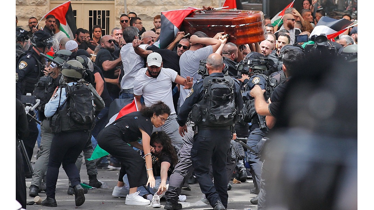 A la sortie du cercueil de l'hôpital Saint-Joseph à Jérusalem-Est, secteur palestinien de la ville également occupé par Israël, la police a fait irruption dans l'enceinte de l'établissement et chargé une foule brandissant des drapeaux palestiniens.