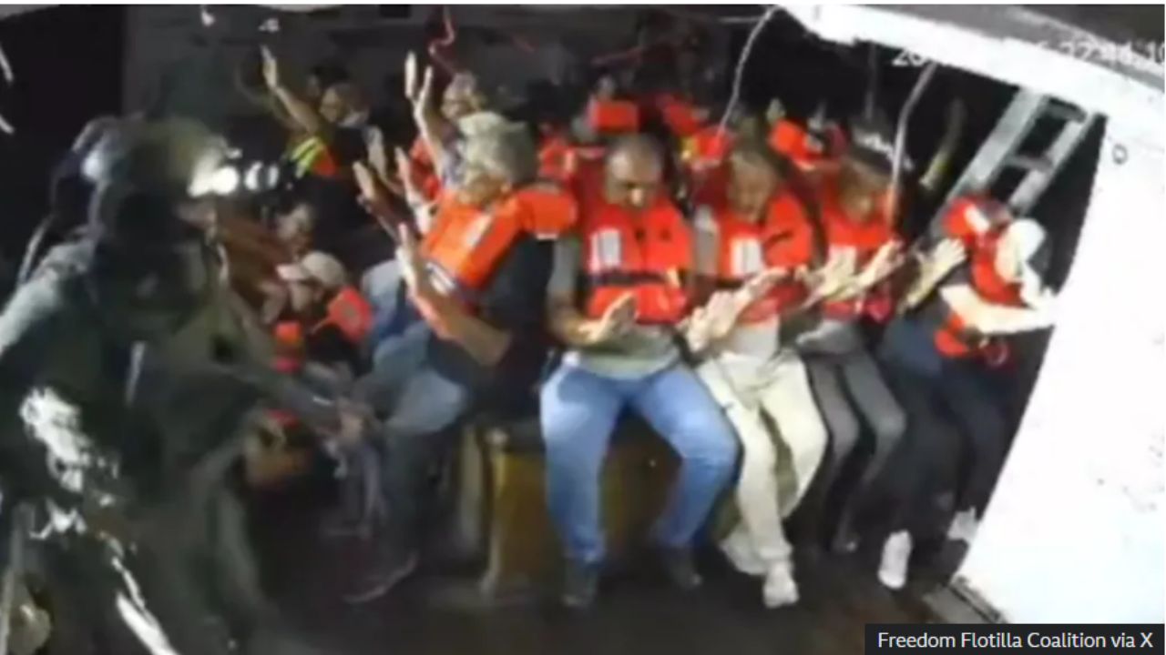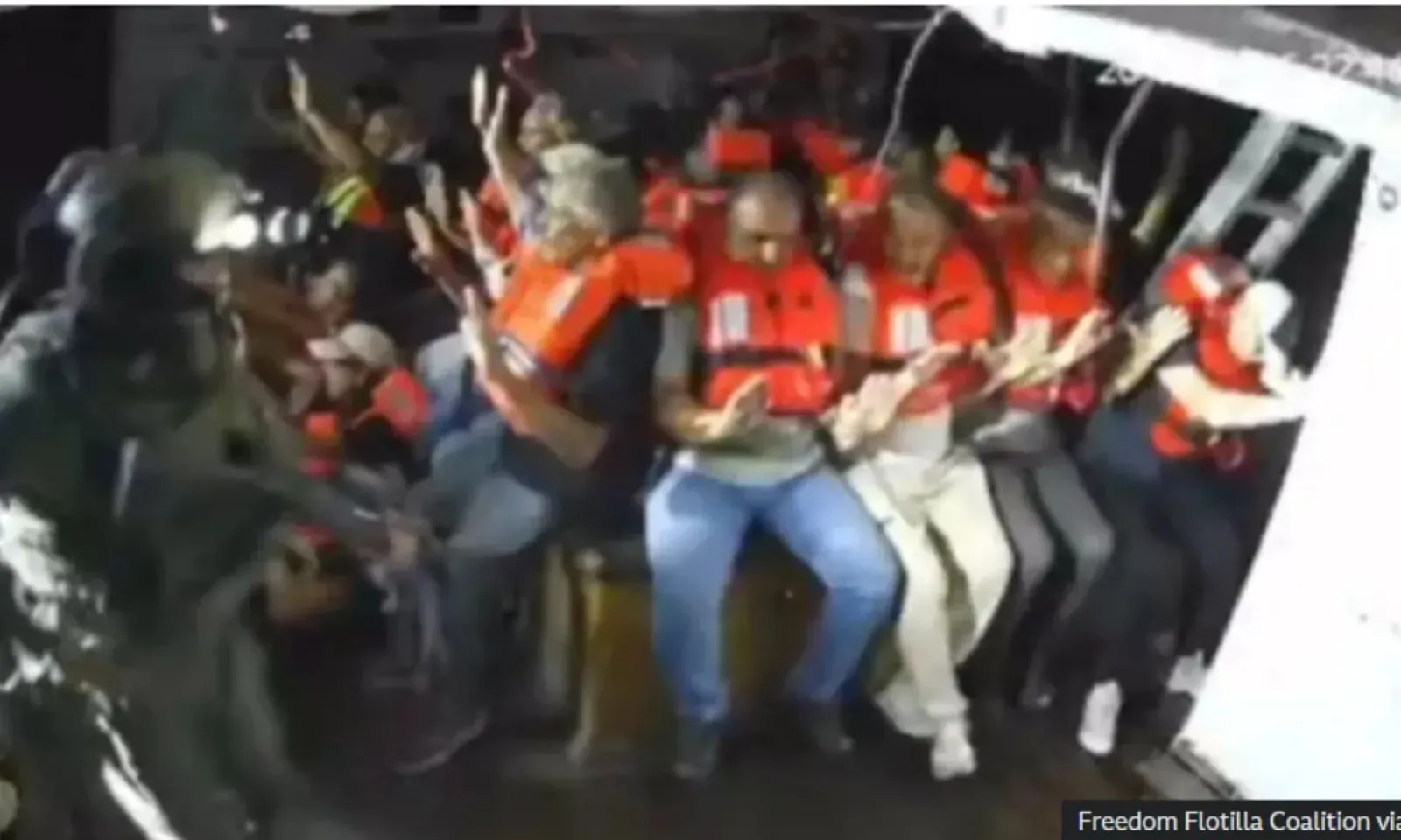 Des images diffusées sur les réseaux sociaux montrent plusieurs militaires armés prenant le contrôle du navire tandis que les passagers, mains levées, restent assis à bord.