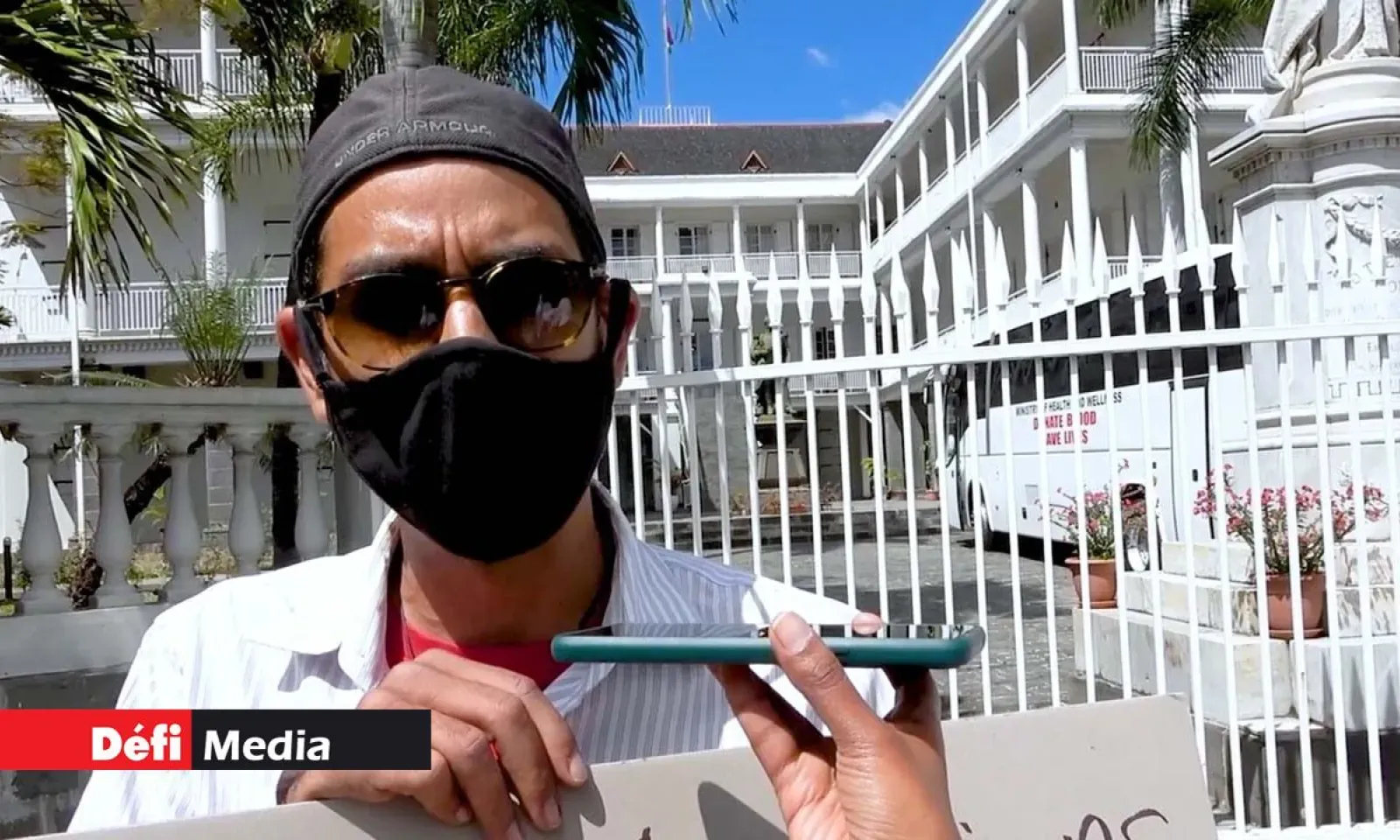 Manifestation de l’activiste Ivan Bibi devant la Government House, à Port-Louis, ce mercredi matin, 6 juillet. Il réclame la démission immédiate du Premier ministre et du Speaker au lendemain de la Private Notice Question (PNQ), du leader de l’Opposition. Il parle de « complicité » du Speaker après les allégations du CEO démissionnaire de Mauritius Telecom Sherry Singh contre Pravind Jugnauth.