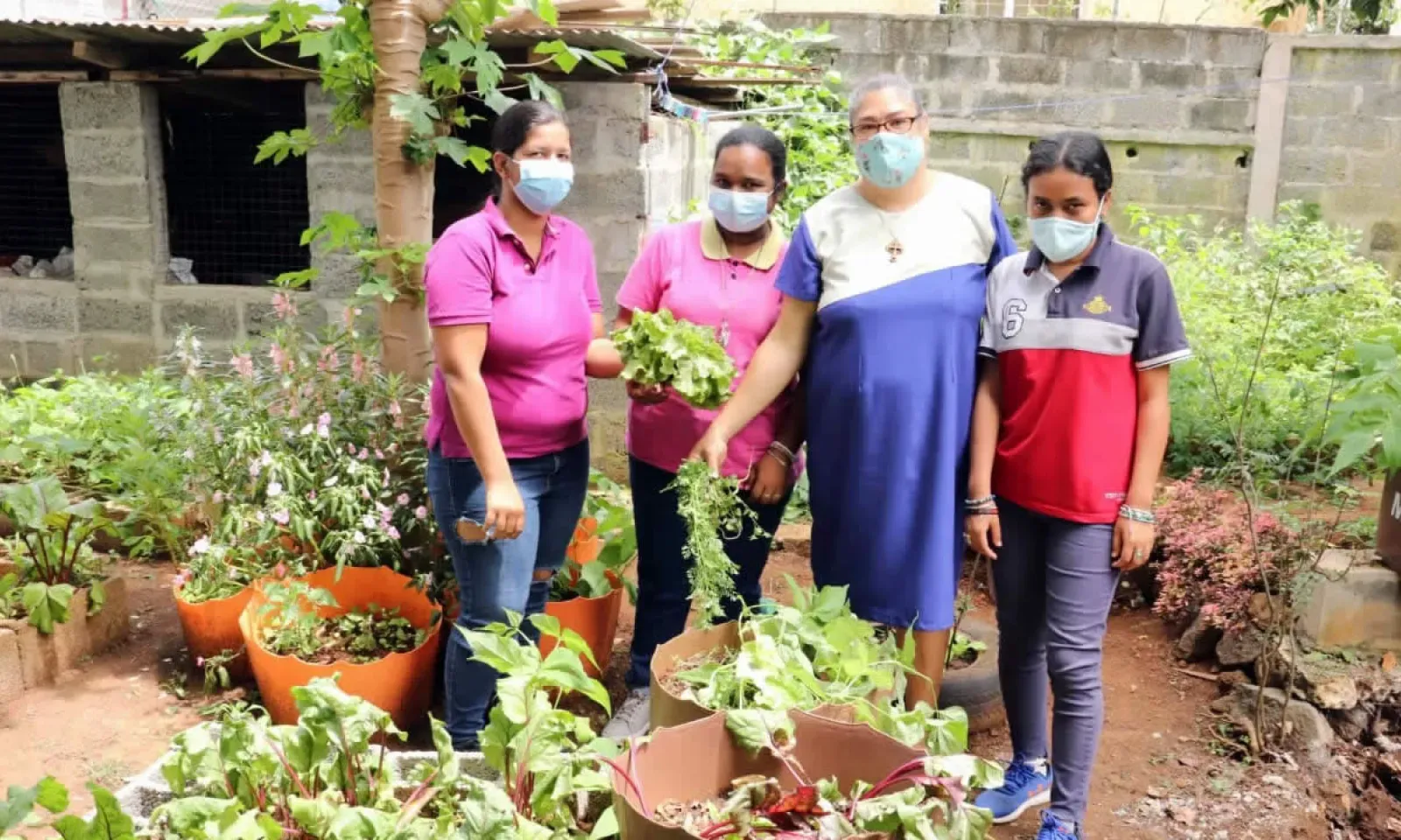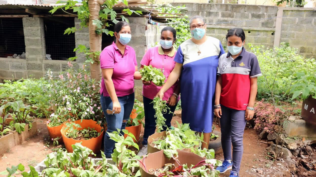 Dans une salle, nous avons fait la connaissance de Joëlle, Shirleen, Véronique, Gaëlle, Rebecca et Dominique. Elles faisaient de la broderie et de la couture en compagnie de leur éducatrice Mireille Manuel. Plus loin, nous avons salué Geneviève Chinnasamy qui faisait le thé. Nous apprenons que Natasha, rencontrée il y a quelques minutes, est sa fille. En poursuivant notre visite, nous allons sous un préau, là où les jeunes du Centre de Trinité prennent l’air, se recueillent pour les prières ou jouent en cours de journée. À moins d’un mètre, le mari de Geneviève Chinnasamy, Jean, une pioche à la main, prépare la terre pour les jeunes du centre qui s'apprêtent à réaliser leur jardin bio avec le soutien de leurs éducatrices. Il y a toute une variété de légumes. Tous les vendredis, ce sont ces légumes qui sont cueillis pour le repas de midi que tout le monde partage autour d’une table, explique Marie France Violette. Cette dernière est la directrice du Centre de la Trinité.