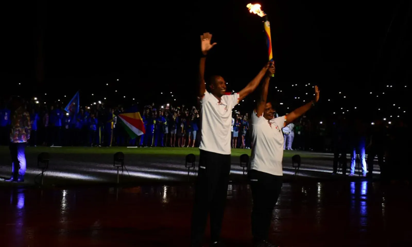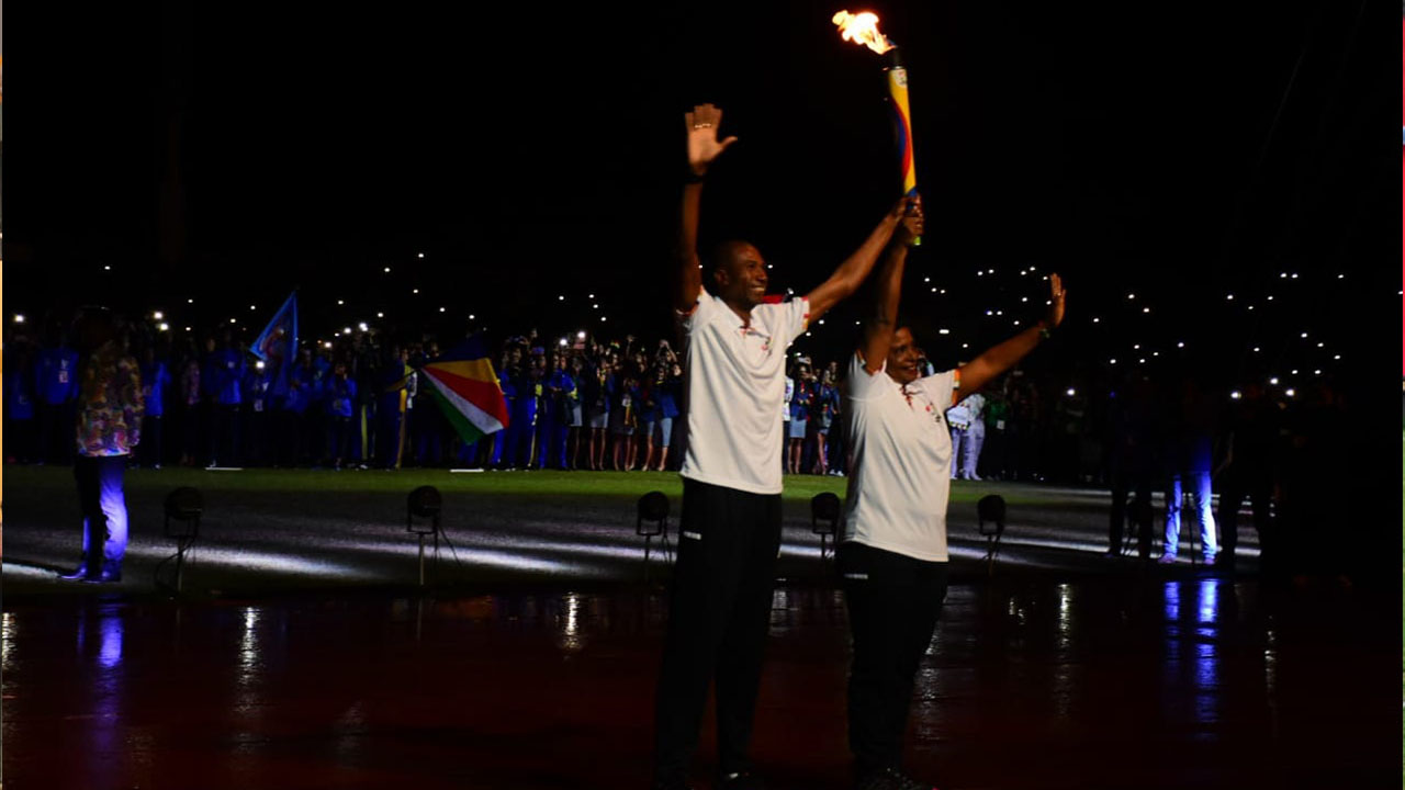 Les deux derniers relayeurs de la flamme, qui ont allumé la vasque des Jeux des îles de l’océan Indien 2019, sont Marie-Lourdes Allysamba-Appadoo et Eric Milazar