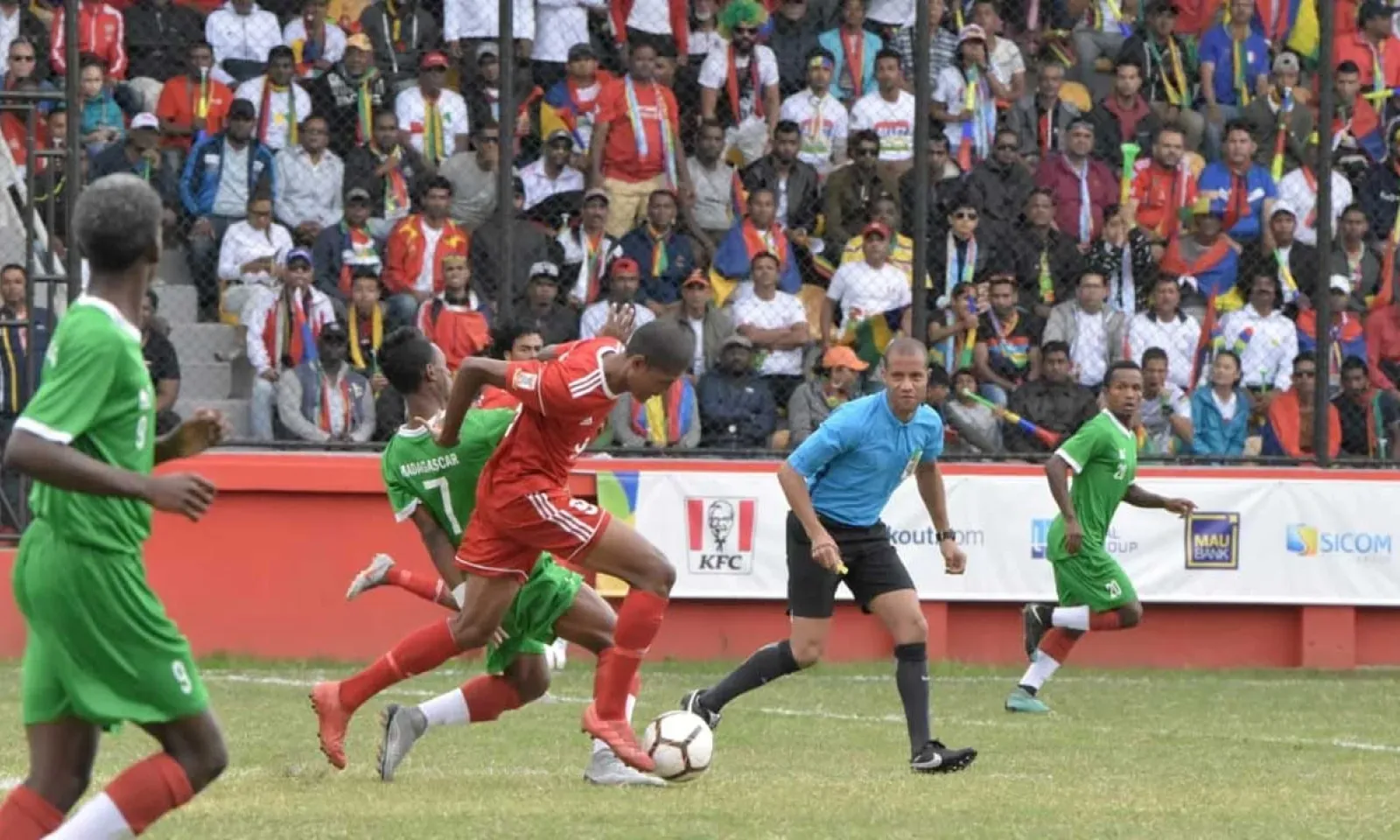 Pour ce match couperet et de la peur entre Maurice et Madagascar, l’ambiance était au rendez-vous dans les tribunes du stade George V à Curepipe, avec un public mauricien qui a poussé ses favoris durant cette première période. Les vuvuzelas ont résonné et les drapeaux quadricolores ont coloré les gradins à guichets fermés.
