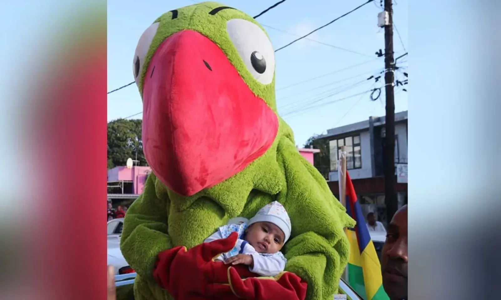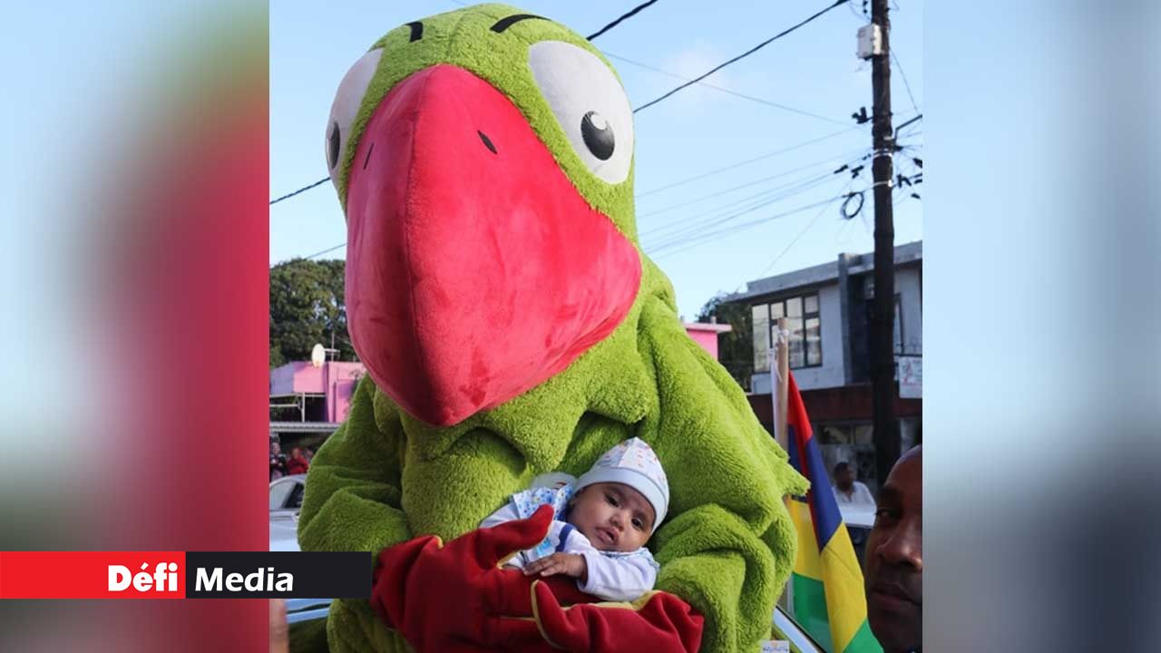 Il n'est pas là que pour assurer l'ambiance. Krouink, la mascotte officielle des Jeux des îles de l’ocean Indien (JIOI), sait également pouponner les bébés.