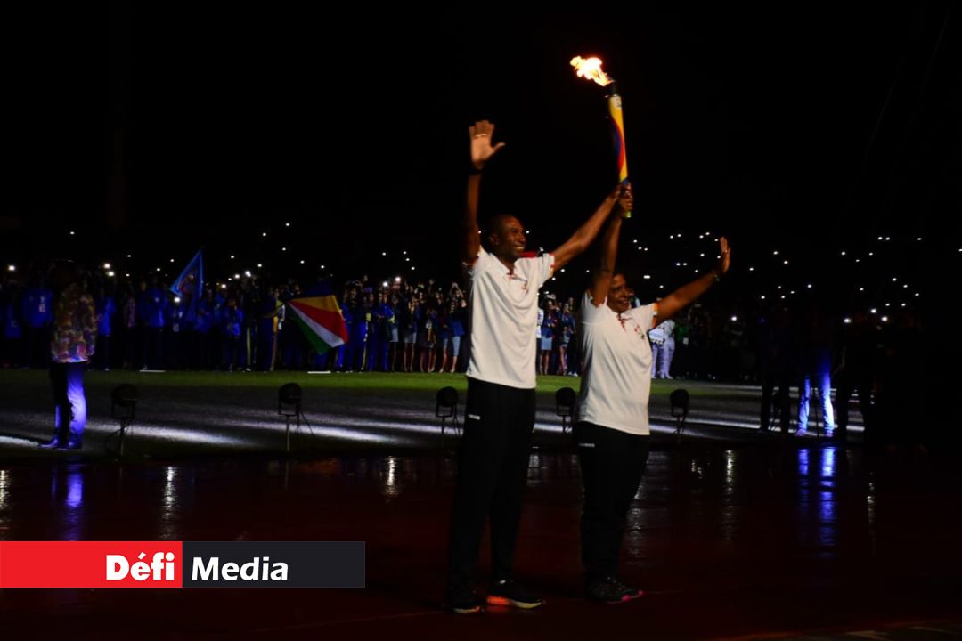 Les deux derniers relayeurs de la flamme ont allumé la vasque des JIOI. Ils sont Marie-Lourdes Allysamba-Appadoo et Eric Milazar.