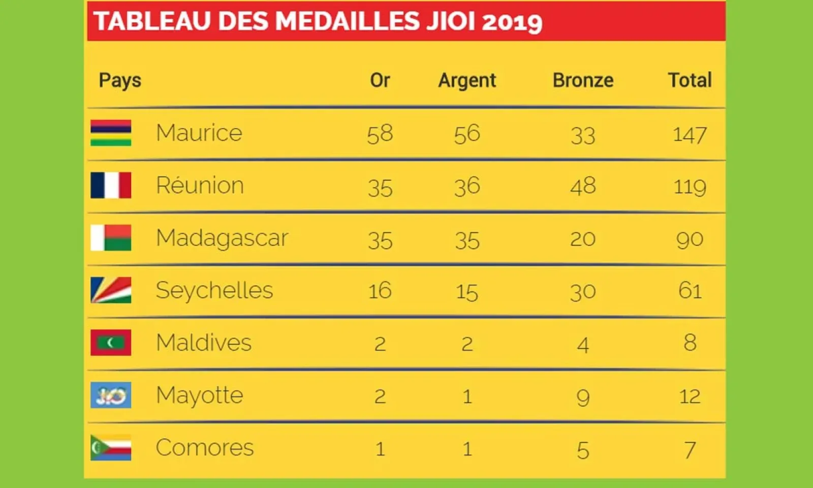 La Réunion est en deuxième position avec 119 médailles (35 or, 36 argent et 48 bronze). Madagascar est troisième avec 90 médailles (35 or, 35 argent et 20 bronze).