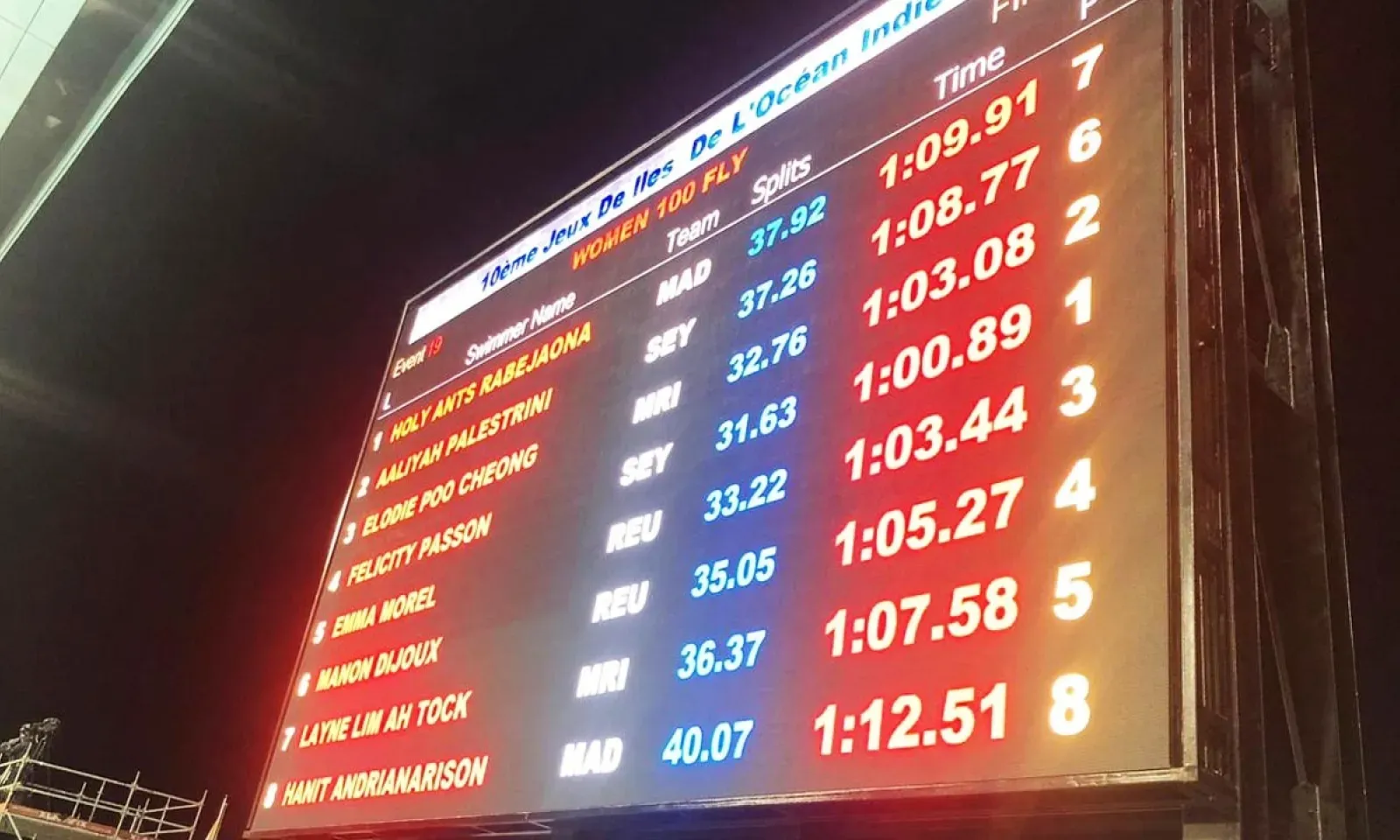 La mauricienne, Elodie Poo Cheong, a créé la surprise en remportant la médaille d’argent au 100 m papillon dames et en terminant devant la Réunionnaise Emma Morel.
