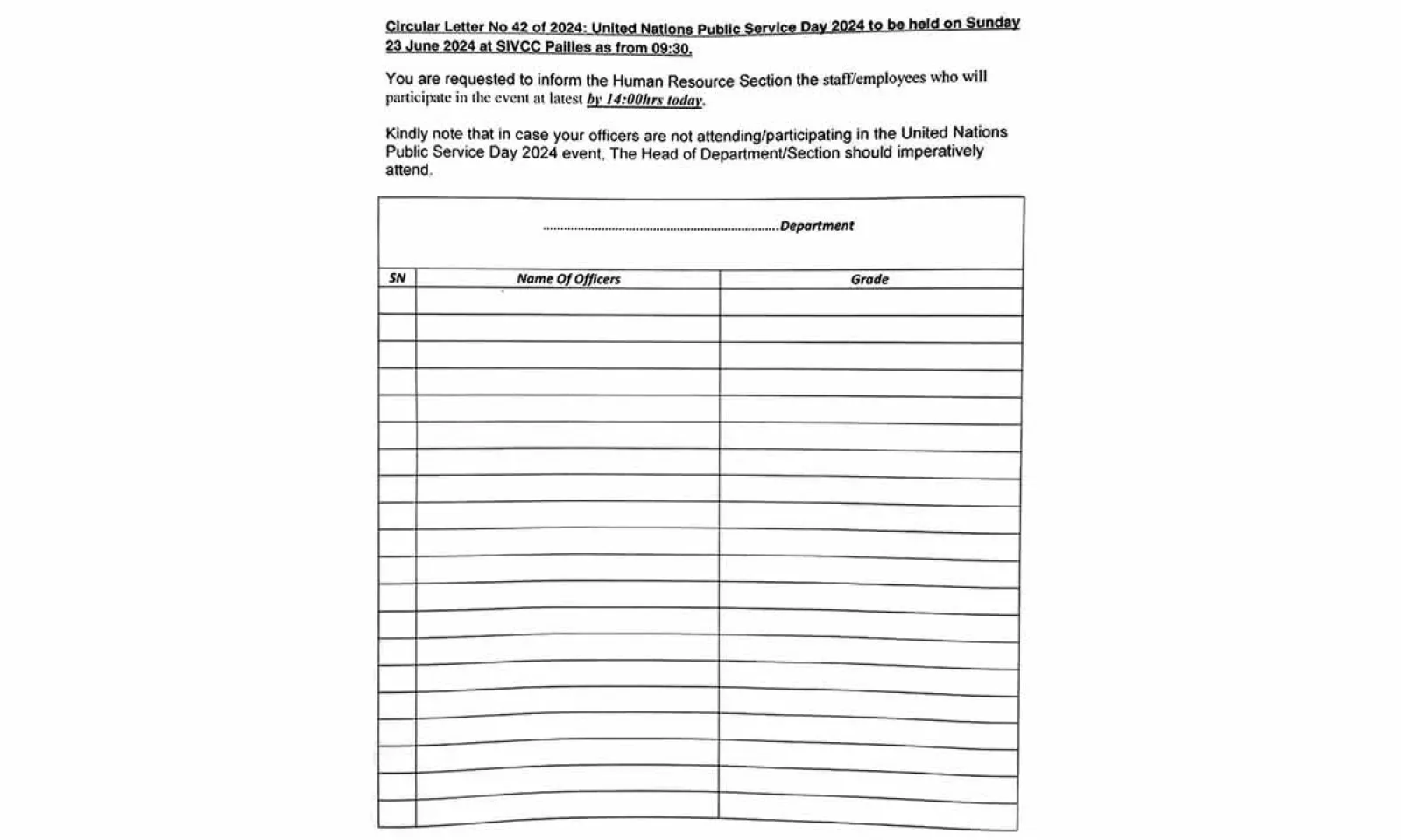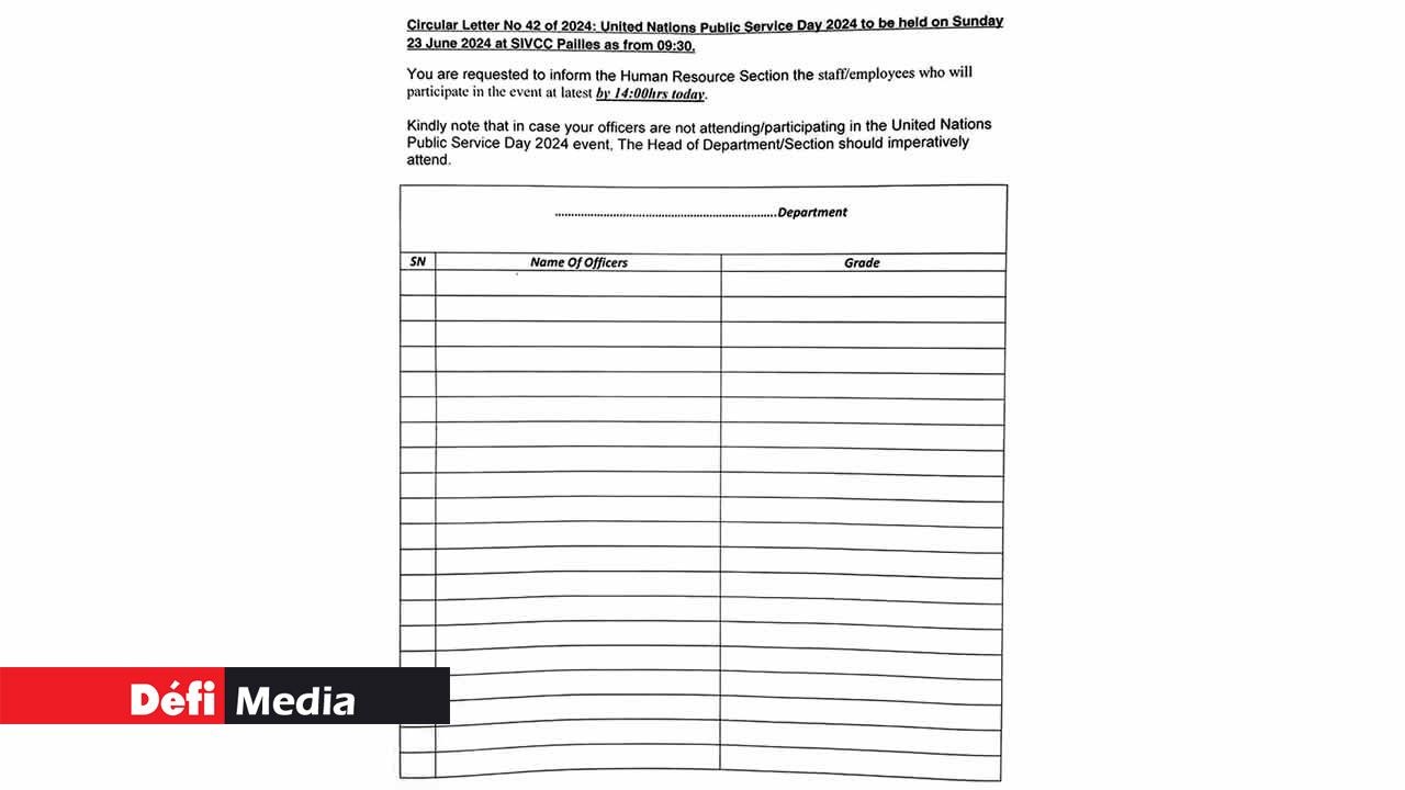 Toujours dans le cadre de cet événement, la lettre circulaire No 42 de 2024 a été émise pour demander aux chefs de département d’informer les Human Resources Sections de chaque ministère de communiquer sur les employés qui seront présents. « Notez qu’au cas où vos officiers ne participent pas, le Chef de département/section doit être impérativement présent », précise encore la circulaire.