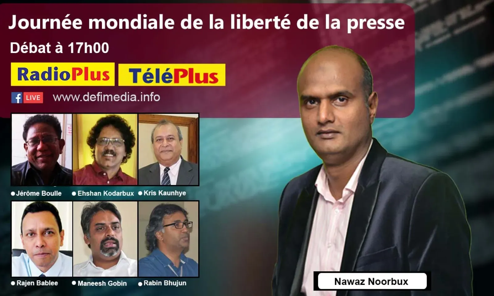 La presse est-elle vraiment libre ? ; l'impact des technologies et des réseaux sociaux sur le métier de journaliste ; la fusion annoncée entre l'Independent Broadcasting Authority (IBA) et l'Information and Communication Technologies Authority (ICTA), la Freedom of Information Act... Autant de thèmes qui seront abordés par Nawaz Noorbux et ses invités. Ces derniers sont : Ehshan Kodarbux, directeur du Défi Media Group, Kris Kaunhye, directeur de Top FM, Jérôme Boulle, représentant de l'Union internationale de la presse francophone et Rajen Bablee, directeur exécutif de Transparency Mauritius.