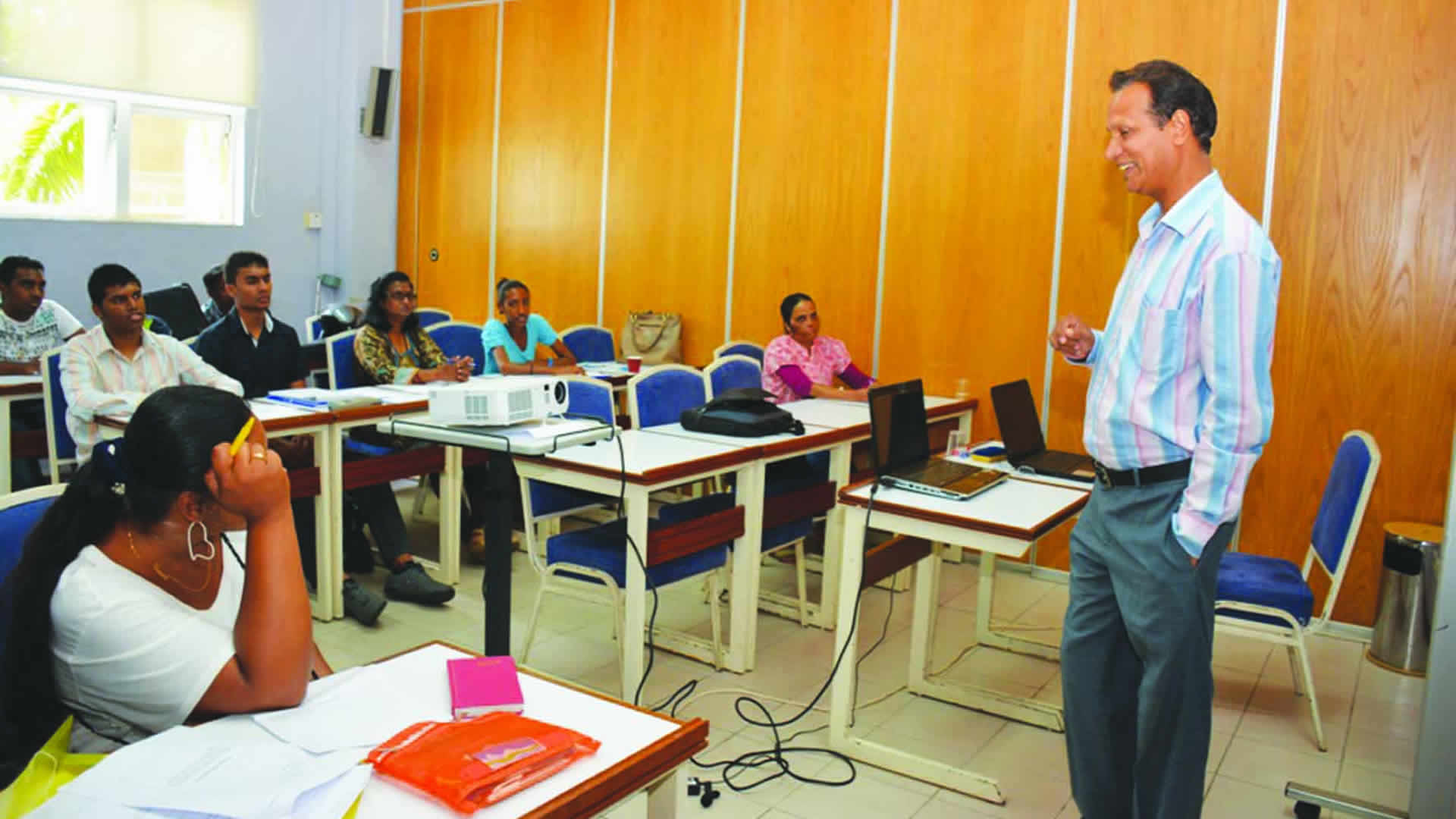 Manoj Aubeeluck, chargé de cours à temps partiel à Business Mauritius, en est à sa troisième session de formation avec des étudiants souffrant de handicap. Une vingtaine de jeunes et de moins jeunes suivent à son cours. Attentifs et appliqués, rien ne laisse paraître, au premier abord, qu’ils sont handicapés. Le thème abordé, l’éthique du travail, suscite de nombreuses questions et les échanges fusent entre étudiants et chargé de cours.
