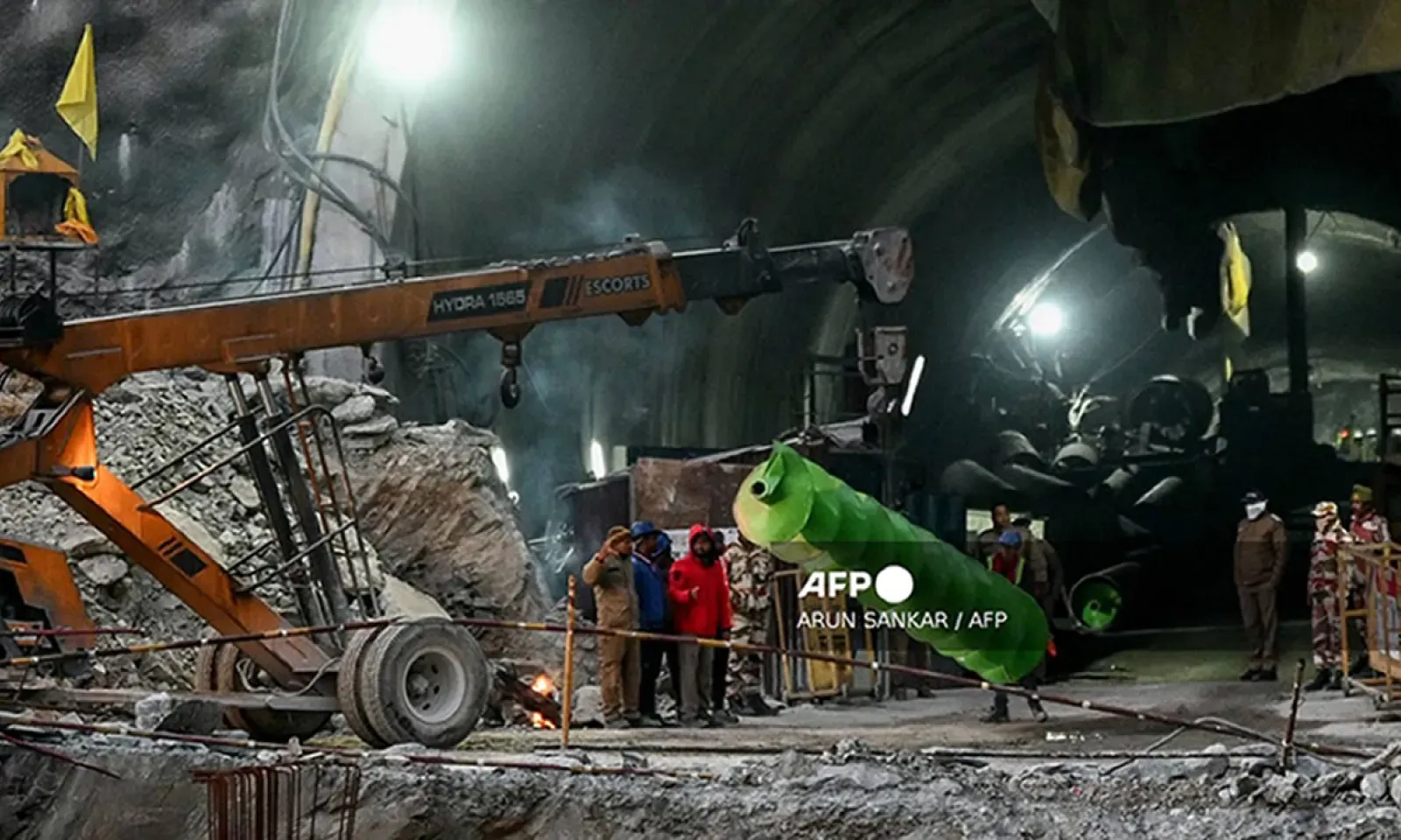 Des excavatrices ont déjà extrait des tonnes de terre, de béton et de gravats à la suite de l'effondrement du tunnel en construction, le 12 novembre, dans l'État himalayen de l'Uttarakhand.