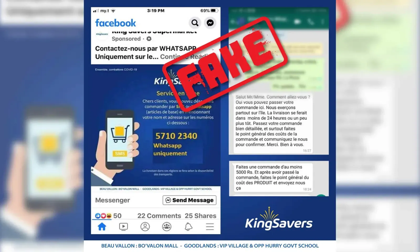 D'abord, les supermarchés King Savers disent être victimes de fausses publicités. Il a été porté à leur attention qu’une fausse publicité cachant une arnaque circulent sur Facebook et WhatsApp concernant un service de livraison proposé.
