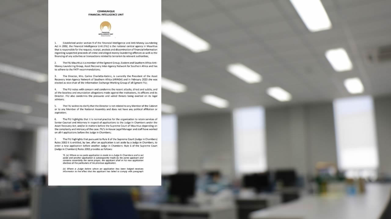 La Financial Intelligence Unit s’en remet à la police après les attaques à l’encontre de sa directrice et ses officiers. L’organisme a émis un communiqué ce samedi précisant que Carine Charlette-Katinic n’a aucun lien de parenté avec des membres du gouvernement ni aucune affiliation politique.