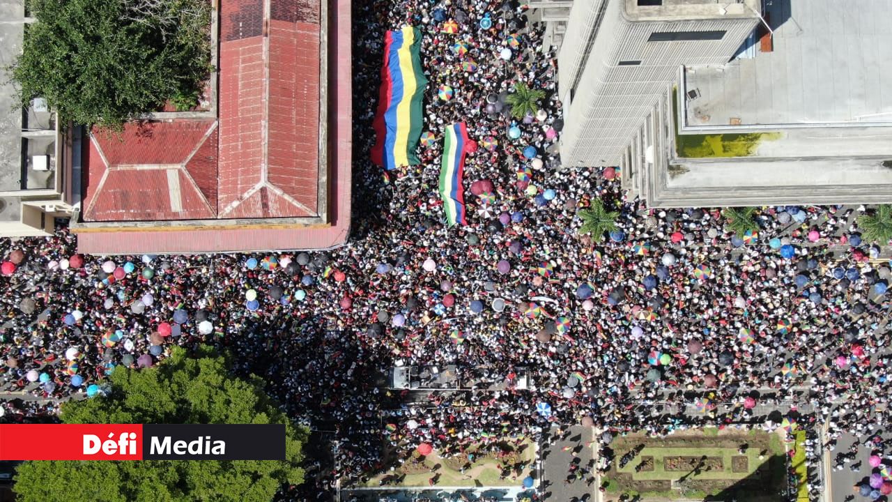 Ce sont les images prises par drone vers 14 h 23 lors du rassemblement des partis de l’opposition, de Linion Sitwayin et des plateformes citoyennes, ce samedi 13 février. Les participants, notamment les leaders des partis de l’opposition, Navin Ramgoolam, Paul Bérenger et Roshi Bhadain sans oublier le porte-parole de l’Inion Sitwayin Bruneau Laurette se sont réunis peu avant 14 heures devant la municipalité de Port-Louis. S’en est suivie une marche citoyenne qui prendra fin devant l’Hôtel du gouvernement.