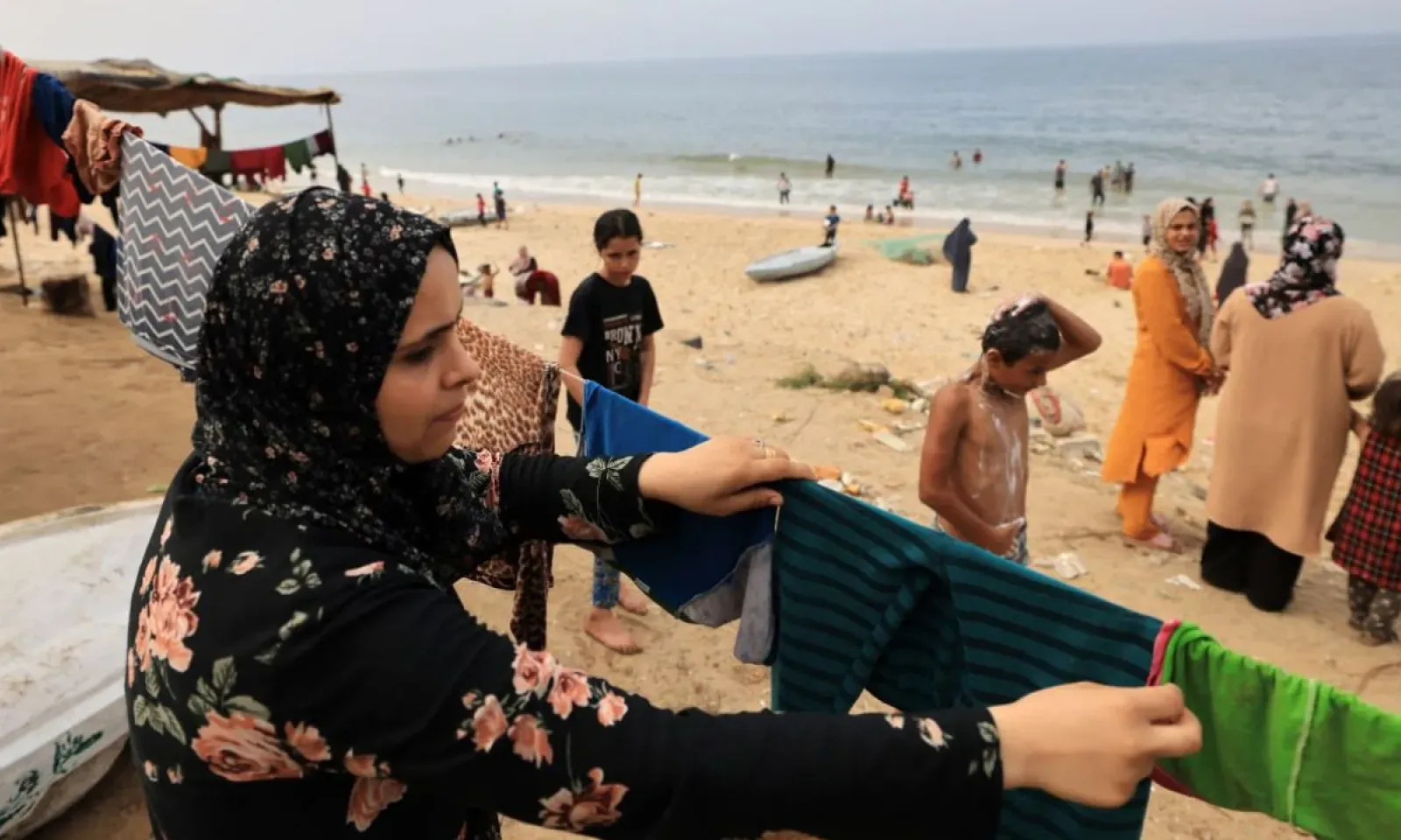 Sur une plage de Gaza, un jeune garçon se penche sur une cuve en plastique remplie d'eau savonneuse et de linge. À proximité, une femme utilise du sable pour nettoyer des casseroles en métal. Un homme se tient jusqu'à la taille dans la mer pour nettoyer un pantalon de survêtement, tandis qu'ailleurs, trois femmes s'assoient dans la Méditerranée salée, laissant les vagues déferler sur leurs robes.