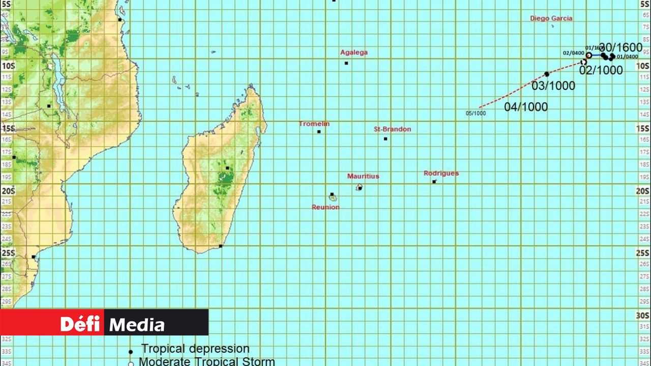 À 04h00 ce matin, elle était centrée autour du point 9.7 degrés sud en latitude et 75.2 degrés est en longitude. Elle se déplace vers l'ouest à une vitesse d'environ 8 km/h. Selon la station météo, elle n'influencera pas les conditions météorologiques sur les Mascareignes au cours des deux prochains jours.
