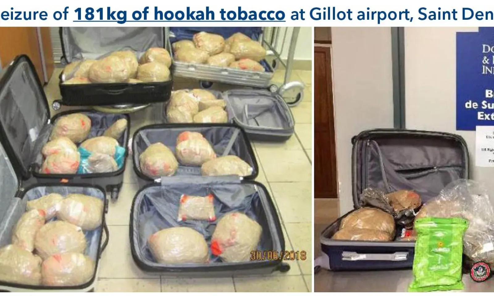 Ils partiront en fumée avant même d’avoir été consommés. 181 kilos de tabac à chicha (hookah tobacco) ont été saisis le 30 juin par la douane réunionnaise à l’aéroport St-Denis Gillot, à l’île sœur, sur quatre passagers réunionnais qui étaient en transit à Maurice. Ils revenaient de Dubaï.