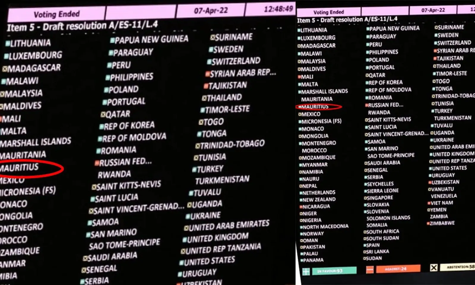Maurice fait partie de ces 93 pays ayant voté en faveur. Parmi les autres pays ayant voté pour l’on retrouve : La France, l’Allemagne, les Etats-Unis, l’Espagne, le Royaume-Uni et le Portugal.