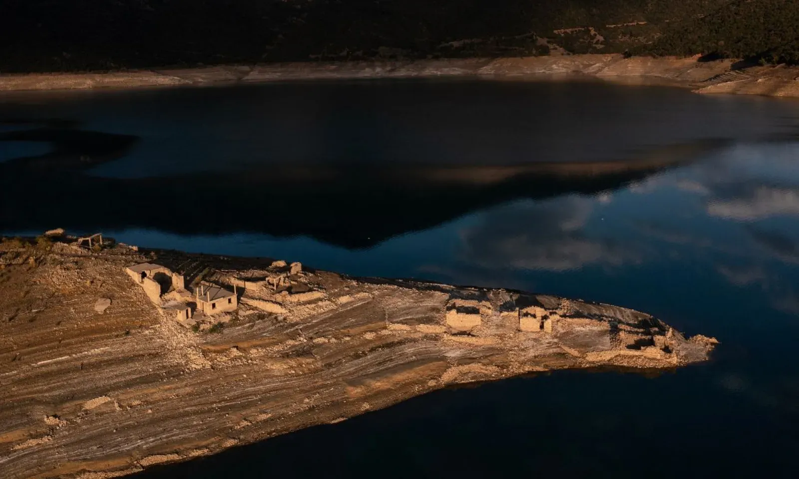 Des bâtiments abandonnés du village englouti de Kallio en Grèce centrale sont récemment réapparus avec la baisse considérable du niveau d'un lac de barrage, principal réservoir d'eau d'Athènes, provoquée par la sécheresse prolongée qui sévit dans le pays.